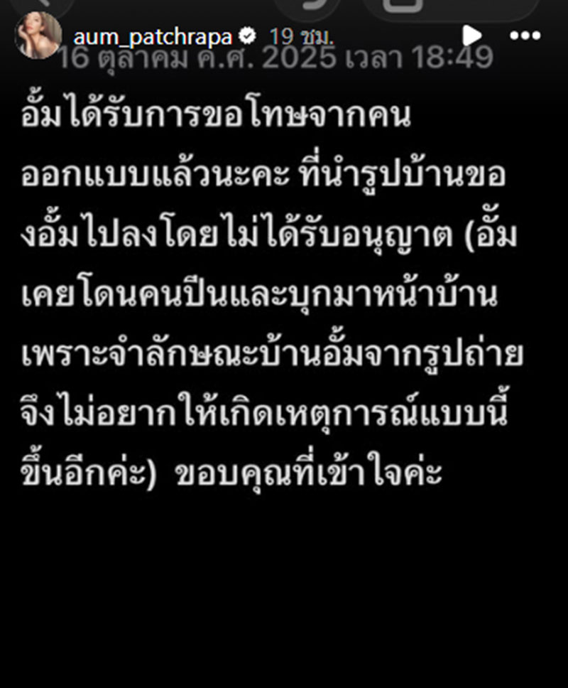17 ตุลาคม 2568 จากกรณีที่นางเอกซุปตาร์ 'อั้ม' พัชราภา ไชยเชื้อ ได้ออกมาโพสต์ไอจีสตอรีส่วนตัว "@aum_patchrapa" ทางเพจนำรูปบ้านของเธอได้เผยแพร่ลงบนโลกโซเชียล พร้อมเขียนข้อความเชิงเปรียบเทียบบ้านดาราที่สินค้าออนไลน์กับบ้านของลูกค้า โดย 'อั้ม พัชราภา' ได้โพสต์ให้ทางเพจดังกล่าวลบโพสต์ทันที พร้อมกับให้ขอโทษและทิ้งโพสต์ขอโทษ 2 อาทิตย์ (อ่านข่าวที่เกี่ยวข้อง : 'อั้ม พัชราภา'เดือดสุด! ถูกนำรูปบ้านมาเผยแพร่ลงโซเชียล สั่งลบทันที-โพสต์ขอโทษ)