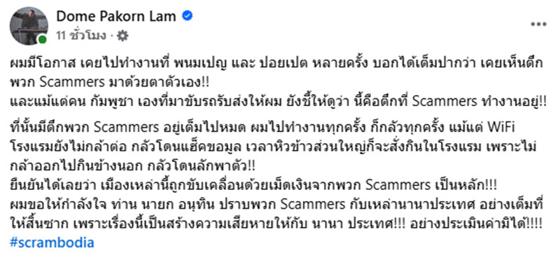 'โดม ปกรณ์ ลัม' ได้โพสต์เล่าเรื่องราวดังกล่าวว่า "ผมมีโอกาสเคยไปทำงานที่ พนมเปญ และ ปอยเปต หลายครั้ง บอกได้เต็มปากว่าเคยเห็นตึกพวก Scammers มาด้วยตาตัวเอง!! และแม้แต่คนกัมพูชาเองที่มาขับรถรับส่งให้ผม ยังชี้ให้ดูว่านี่คือตึกที่ Scammers ทำงานอยู่!! ที่นั่นมีตึกพวก Scammers อยู่เต็มไปหมด ผมไปทำงานทุกครั้งก็กลัวทุกครั้ง แม้แต่ WiFi โรงแรมยังไม่กล้าต่อ กลัวโดนแฮกข้อมูล