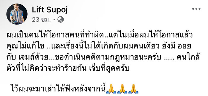 โดยเจ้าตัวเผยว่า “ผมเป็นคนให้โอกาสคนที่ทำผิด... แต่ในเมื่อผมให้โอกาสแล้วคุณไม่แก้ไข และเรื่องนี้ไม่ได้เกิดกับผมคนเดียว ยังมีออยกับเจมส์ด้วย... ขอดำเนินคดีตามกฎหมายนะครับ คนใกล้ตัวที่ไม่คิดว่าจะทำร้ายกัน เจ็บที่สุดครับ ไว้ผมจะมาเล่าให้ฟังหลังจากนี้”