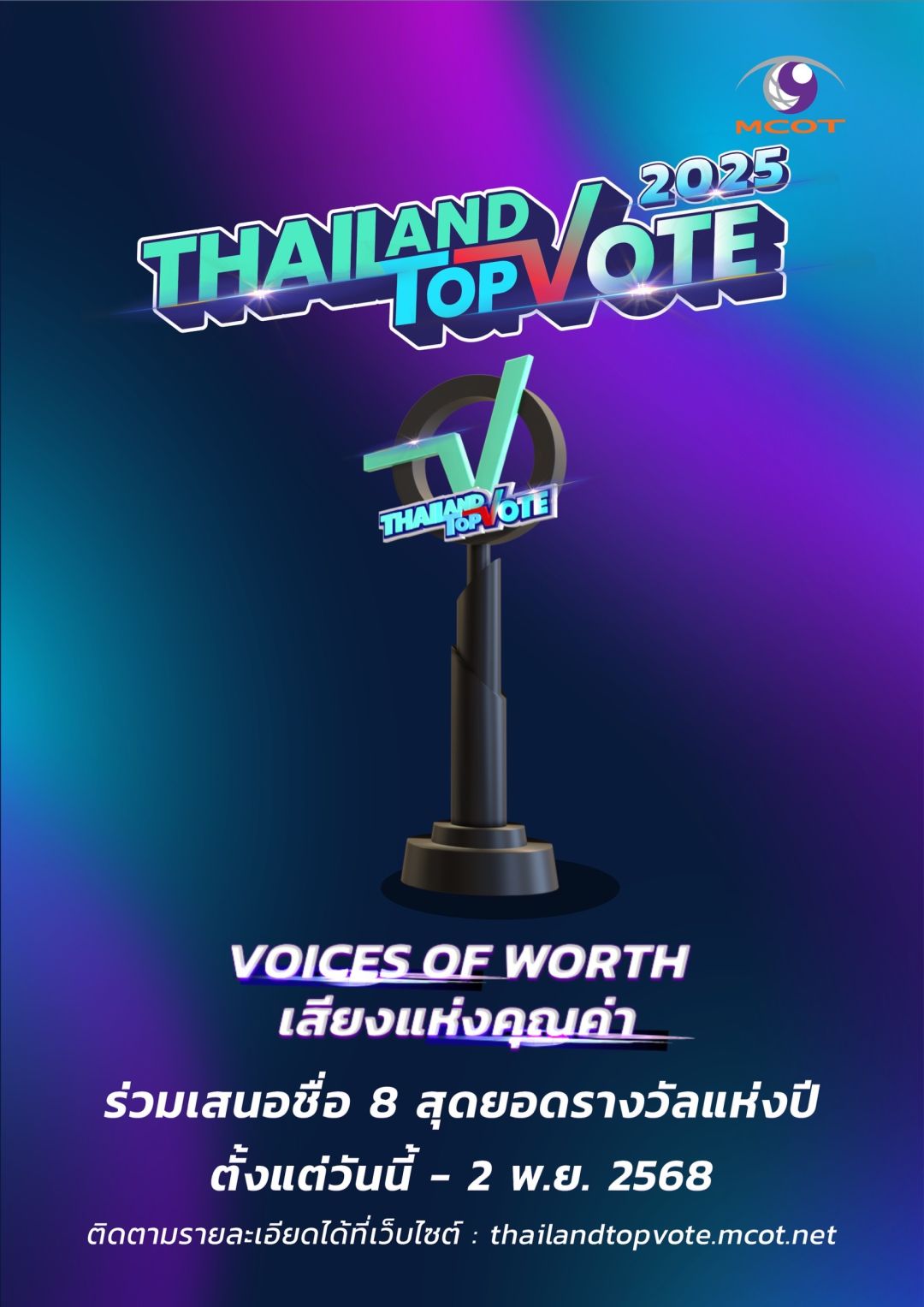 ใครคือผู้ที่จะก้าวเข้าสู่ TOP 5 ของประเทศ ในแต่ละสาขา ปล่อยเสียงที่อยู่ในใจของคุณ ให้เป็นเสียงแห่งคุณค่า ร่วมเสนอชื่อ “Thailand Top Vote 2025”VOICES OF WORTH ติดตามรายละเอียดขั้นตอนการร่วมเสนอชื่อ ได้ทาง https://thailandtopvote.mcot.net/#ThailandTopVote2025
