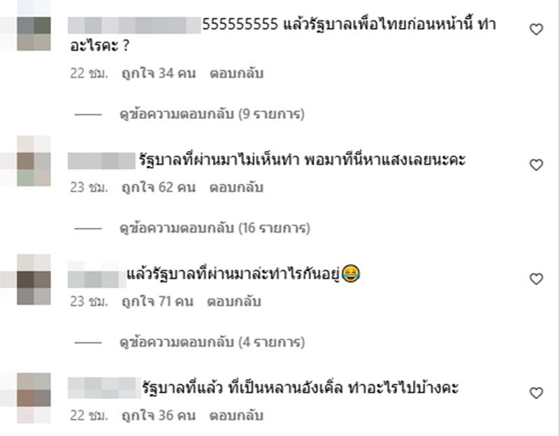 หลังจากที่ 'อ๋อม สกาวใจ' โพสต์ข้อความนี้ออกมานั้น ก็มีชาวโซเชียลเข้าไปแสดงความคิดเห็นเป็นจำนวนมาก อาทิเช่น 55555555 แล้วรัฐบาลเพื่อไทยก่อนหน้านี้ ทำอะไรคะ? , รัฐบาลที่ผ่านมาไม่เห็นทำ พอมาทีนี่หาแสงเลยนะคะ , แล้วรัฐบาลที่ผ่านมาล่ะทำไรกันอยู่ , รัฐบาลที่แล้ว ที่เป็นหลานอังเคิ่ล ทำอะไรไปบ้างคะ