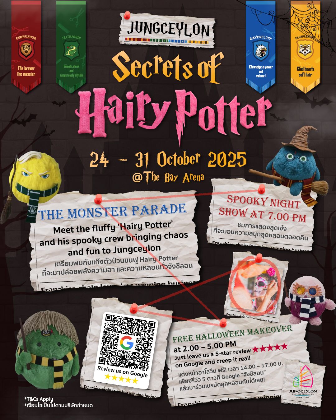 แล้วมาร่วมเปิดประสบการณ์ฮา..โลวีนฉบับใหม่นี้ได้ ในงาน “JUNGCEYLON Secrets of Hairy Potter” ที่จะเริ่มตกแต่งบรรยากาศตั้งแต่วันที่ 24 – 31 ต.ค. 68 และกิจกรรมสุดหลอนในค่ำคืนวันที่ 31 ต.ค. 68 ณ ลานกิจกรรมเดอะเบย์ อารีน่า ศูนย์การค้าจังซีลอน ป่าตอง ภูเก็ต โดยสามารถติดตามรายละเอียดกิจกรรมได้ที่ https://www.facebook.com/JungceylonFanpage หรือสอบถามข้อมูลเพิ่มเติมโทร. 076-600-111