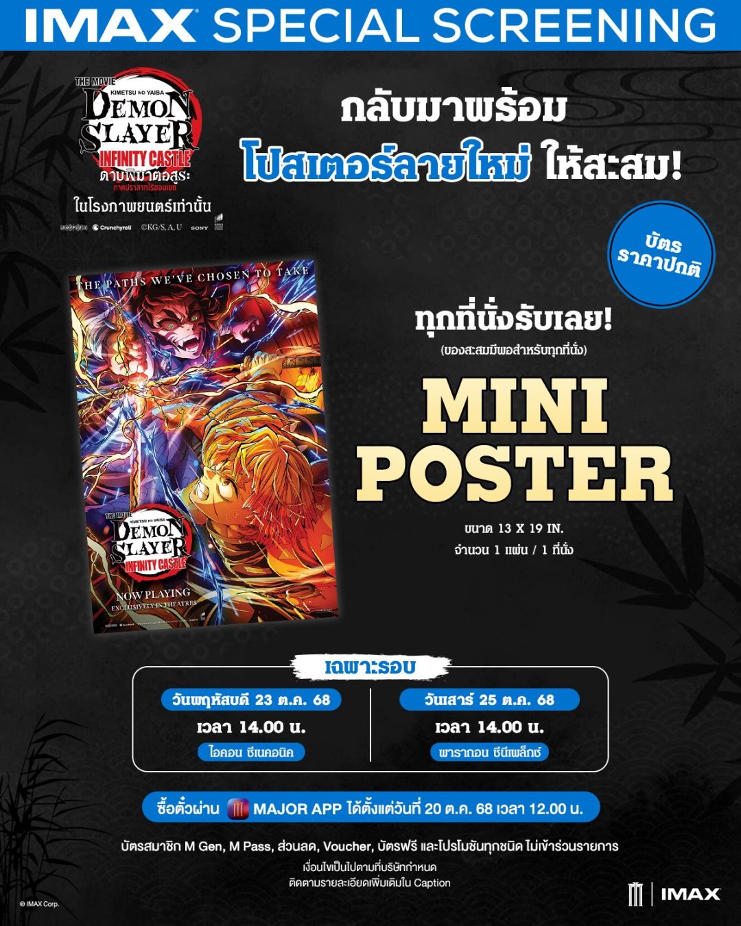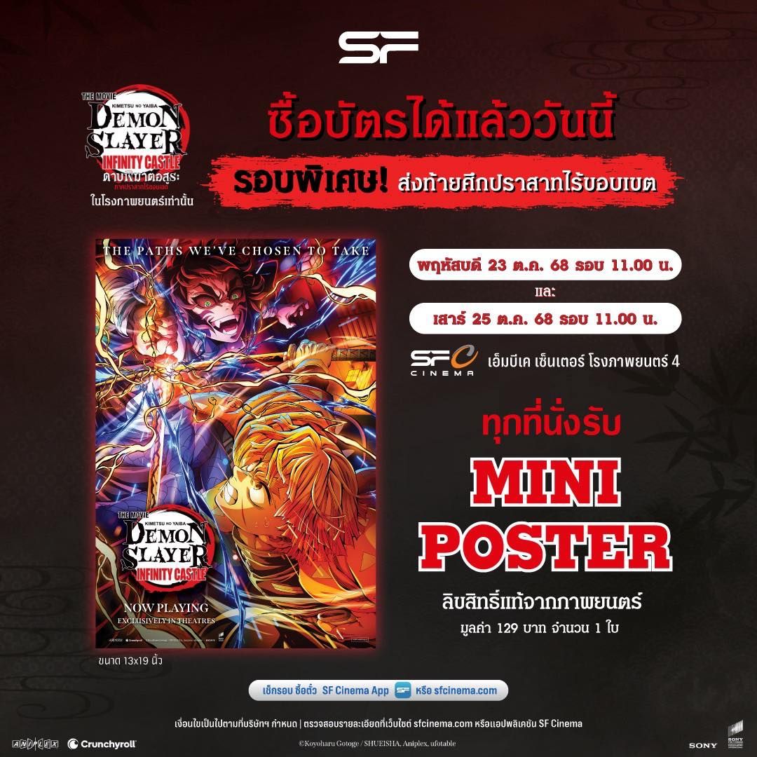 Demon Slayer: Infinity Castle ดาบพิฆาตอสูร ภาคปราสาทไร้ขอบเขต กลับมาฉายในโรงภาพยนตร์ระบบพิเศษอีกครั้ง งานนี้พร้อมแจกโปสเตอร์ลายใหม่ สำหรับรอบพิเศษของแต่ละเครือโรงภาพยนตร์เท่านั้น (ติดตามรายละเอียดรอบฉายได้ที่เครือโรงภาพยนตร์ที่ร่วมรายการ)