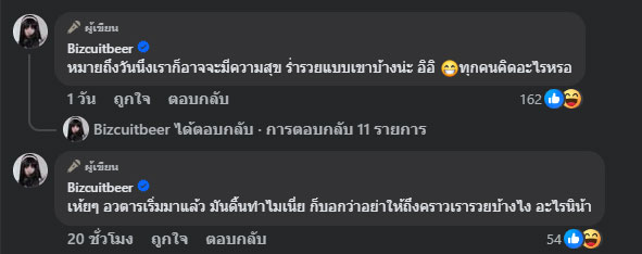 หลังจากนั้น เบียร์ได้เข้ามาคอมเมนต์ตอบกลับว่า “หมายถึงวันนึงเราก็อาจจะมีความสุข ร่ำรวยแบบเขาบ้างน่ะ อิอิ ทุกคนคิดอะไรหรอ” พร้อมคอมเมนต์เพิ่มเติมว่า “เห้ย ๆ อวตารเริ่มมาแล้ว มันดิ้นทำไมเนี่ย ก็บอกว่าอย่าให้ถึงคราวเรารวยบ้างไง อะไรนิน้า”