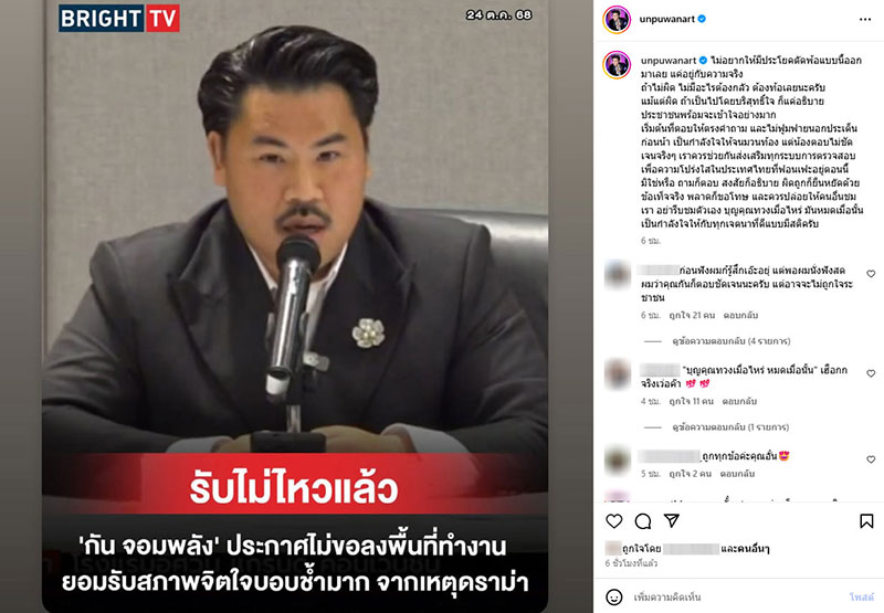 24 ตุลาคม 2568 ภายหลังจากที่ "กัน จอมพลัง" ได้ตั้งโต๊ะแถลงข่าวชี้แจงประเด็นดราม่าความไม่โปร่งใสภายใน มูลนิธิกันจอมพลังช่วยสู้ เมื่อช่วงเช้าวันนี้ โดยในช่วงท้ายของการแถลงข่าว เจ้าตัวได้เปิดใจต่อหน้าสื่อมวลชนว่า “รู้สึกท้อ และสภาพจิตใจตอนนี้บอบช้ำมาก” พร้อมประกาศว่าจะ ไม่ลงพื้นที่ทำงานต่อจากนี้ และจะเปลี่ยนบทบาทไปนั่งเก้าอี้ ประธานมูลนิธิฯ แทน เพื่อให้มูลนิธิเดินหน้าขับเคลื่อนด้วยตัวเอง