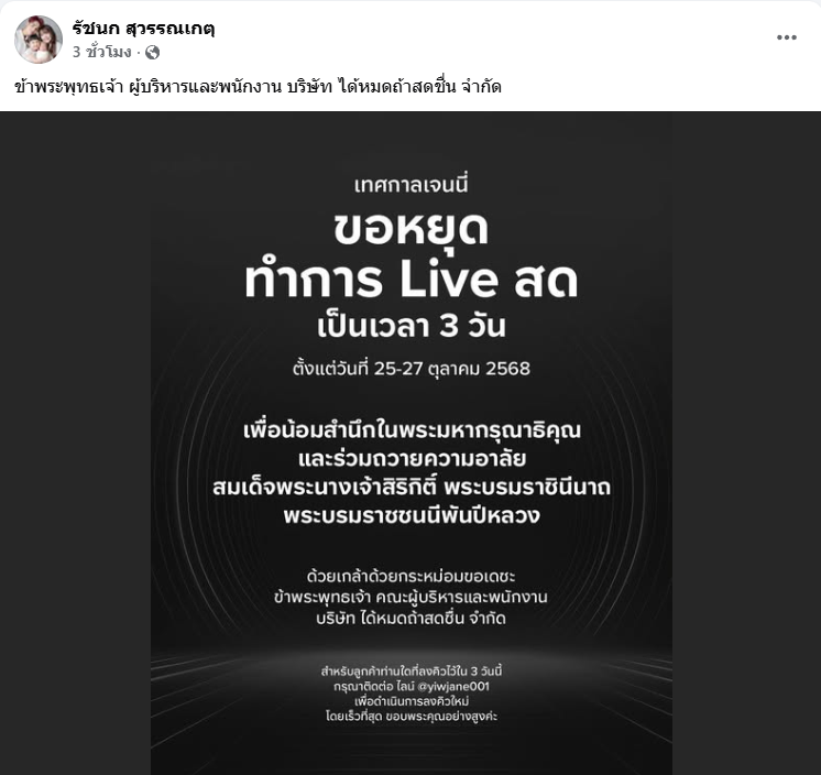 25 ต.ค.68 เจนนี่ ได้หมดถ้าสดชื่น หรือ รัชนก สุวรรณเกตุ ได้โพสต์แจ้งนักช้อปออนไลน์ งดการไลฟ์ขายสินค้า 3 วัน เพื่อร่วมถวายอาลัยต่อ "สมเด็จพระนางเจ้าสิริกิติ์ พระบรมราชินีนาถ พระบรมราชชนนีพันปีหลวง" "ข้าพระพุทธเจ้า ผู้บริหารและพนักงาน บริษัท ได้หมดถ้าสดชื่น จำกัด"