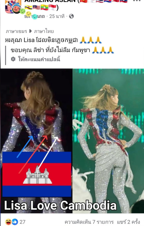 อย่างไรก็ตาม หลังภาพจากโชว์สุดปังนี้ถูกเผยแพร่ออกไปในโลกโซเชียล กลับเกิดประเด็นร้อนเมื่อมีชาวเน็ตบางส่วนจากประเทศกัมพูชา นำภาพของลิซ่าไปโพสต์พร้อมข้อความว่า “ขอบคุณลิซ่าที่ยังไม่ลืมกัมพูชา” ทำให้เกิดกระแสวิพากษ์วิจารณ์ทันที โดยชาวเน็ตไทยต่างเข้ามาคอมเมนต์จำนวนมาก