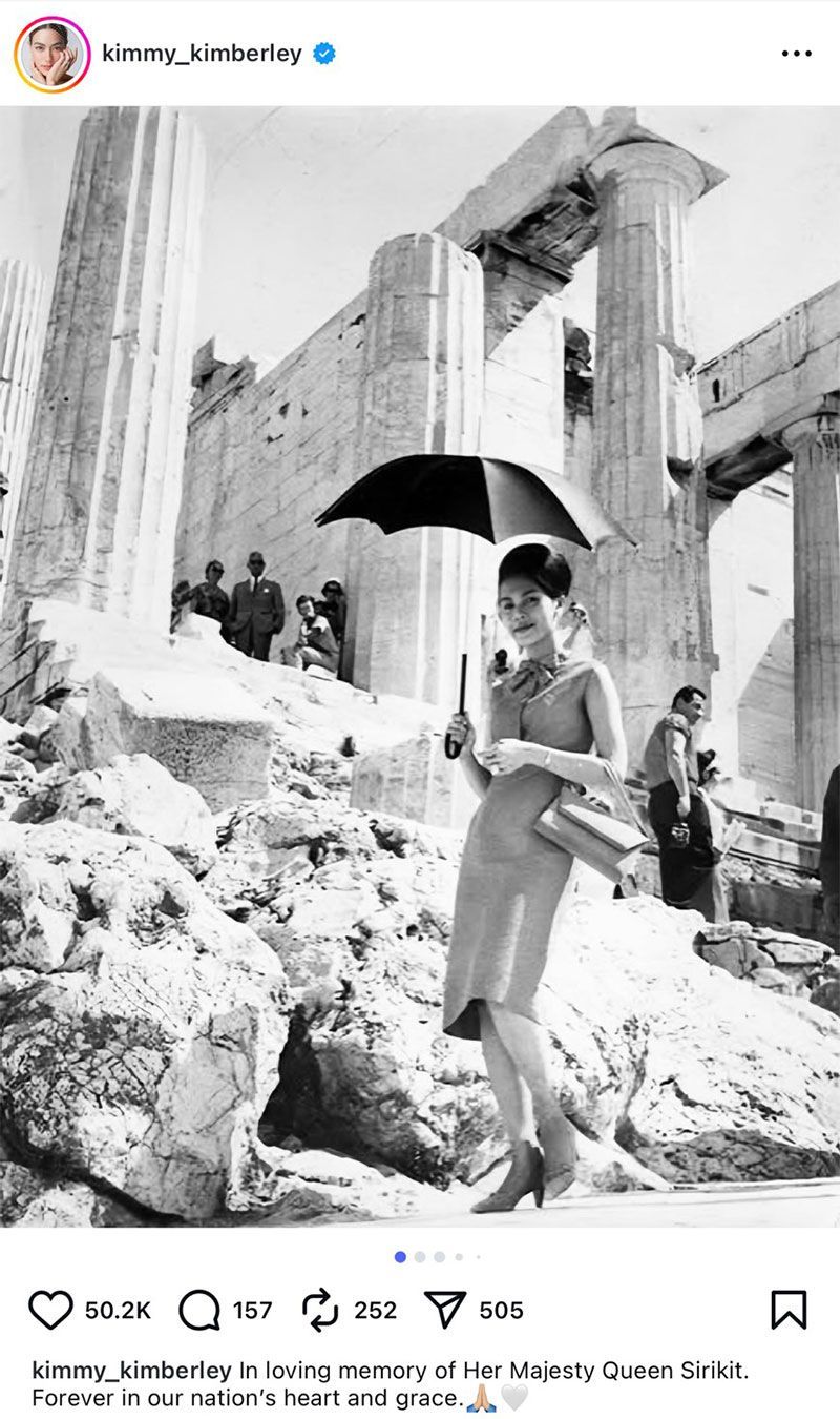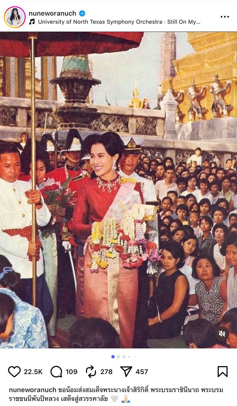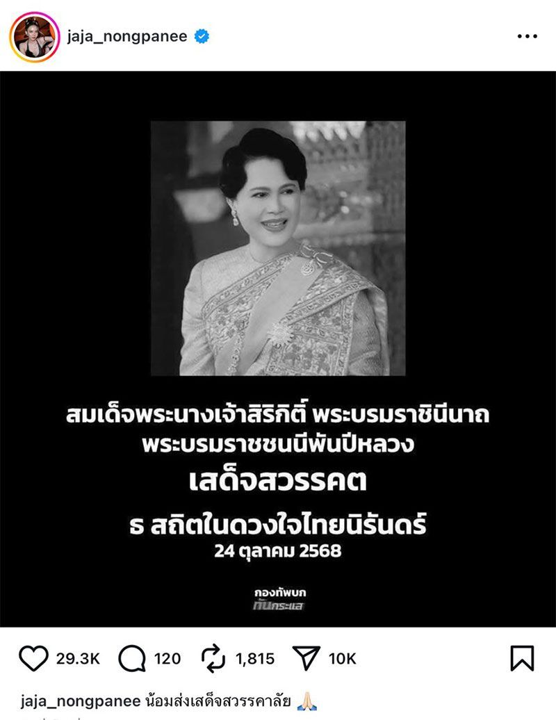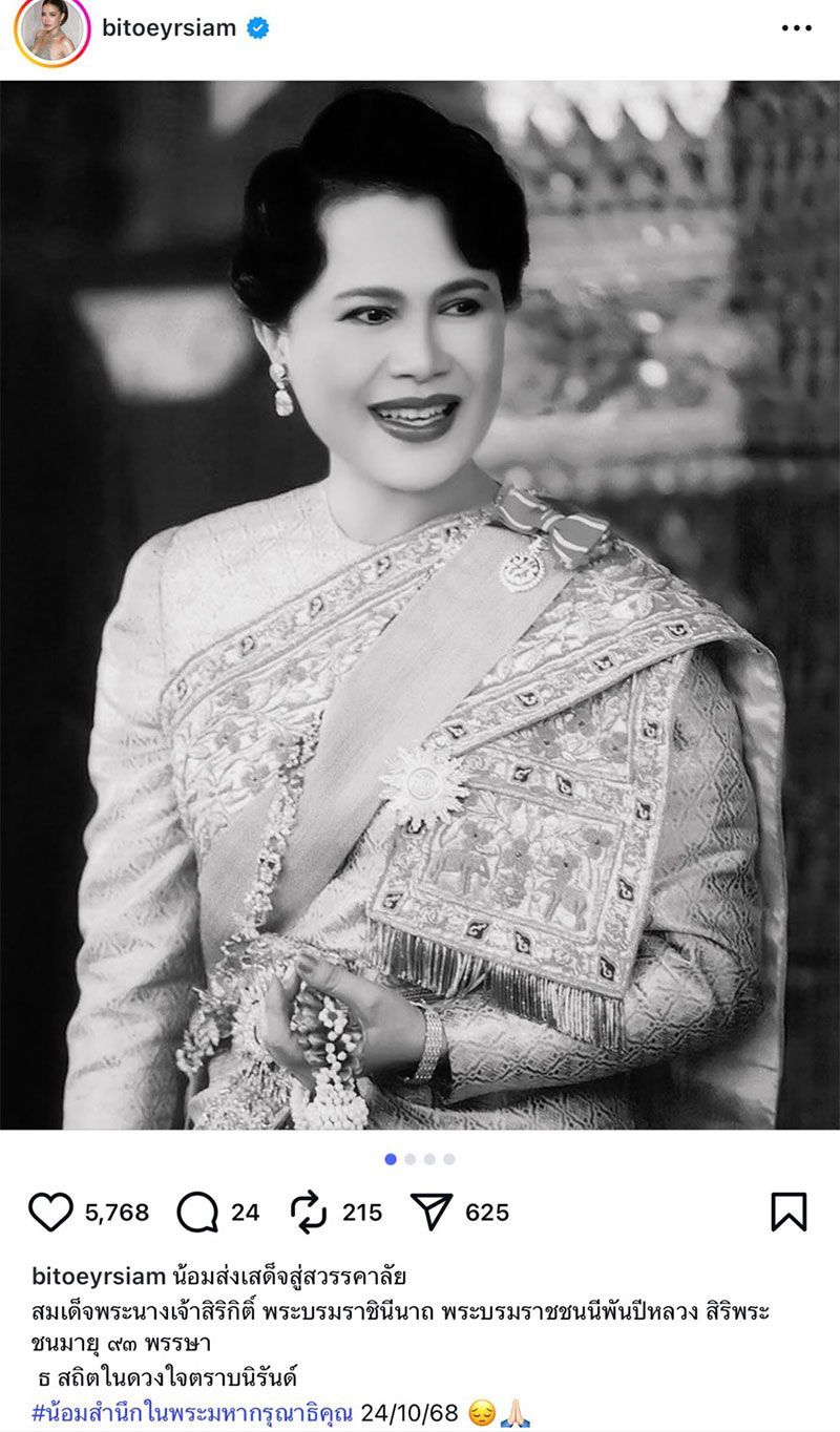 นับเป็นช่วงเวลาแห่งความโศกเศร้าของพสกนิกรชาวไทย หลังจากที่ สำนักพระราชวังได้เผยแพร่ประกาศ สมเด็จพระนางเจ้าสิริกิติ์ พระบรมราชินีนาถ พระบรมราชชนนีพันปีหลวง เสด็จสวรรคต เมื่อในวันศุกร์ที่ ๒๔ ตุลาคม พุทธศักราช ๒๕๖๘ เวลา ๒๑ นาฬิกา ๒๑ นาที ณ โรงพยาบาลจุฬาลงกรณ์ สภากาชาดไทย ด้วยพระอาการสงบ สิริพระชนมพรรษาปีที่ ๙๓โดยเหล่าคนในวงการบันเทิงไทยออกมาพร้อมใจกันโพสต์บนอินสตาแกรมส่วนตัว เพื่อแสดงความอาลัยถวายและน้อมรำลึกถึงพระมหากรุณาธิคุณ 'สมเด็จพระพันปีหลวง' ผ่านทางโซเชียล