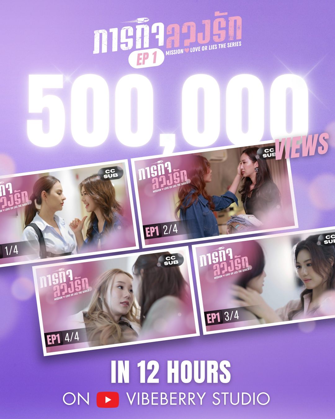 กระแสแรง ตั้งแต่อีพีแรก สำหรับซีรีส์ "Mission Love or Lies ภารกิจลวงรัก" ซีรีส์ฟอร์มดีเคมีแรงแห่งปีเรื่องแรกจากค่าย Vibeberry Studio ที่เพิ่งประเดิมภารกิจแรกบน YouTube ไปเมื่อวันพุธที่ 29 ตุลาคมที่ผ่านมา ได้สร้างปรากฏการณ์กระแสตอบรับอย่างล้นหลาม เพียงไม่ถึง 12 ชั่วโมงหลังออนแอร์ ยอดวิวรวมทะยานพุ่งสูงถึง 500,000 ครั้ง และยังคงพุ่งขึ้นอย่างต่อเนื่องจนถึงขณะนี้ นอกจากยอดวิวที่แรงไม่หยุดแล้ว คอมเมนต์จากแฟน ๆ ทั่วประเทศยังแห่กันมา "ลงเรือ" เชียร์เคมีสุดฟินของ 4 สาวนักแสดงนำอย่างล้นหลาม ต่างคาแรกเตอร์แต่ลงตัวจนต้องจับตาดู!