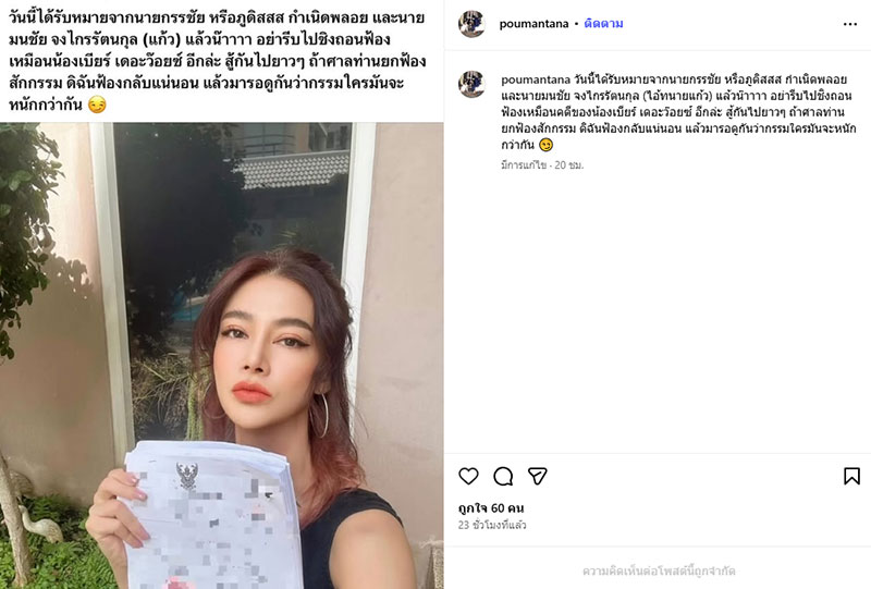 "วันนี้ได้รับหมายจากนายกรรชัย หรือภูดิสสส กำเนิดพลอย และนายมนชัย จงไกรรัตนกุล (ไอ้ทนายแก้ว) แล้วน๊าาาา อย่ารีบไปชิงถอนฟ้องเหมือนคดีของน้องเบียร์ เดอะว๊อยซ์ อีกล่ะ สู้กันไปยาวๆ ถ้าศาลท่านยกฟ้องสักกรรม ดิฉันฟ้องกลับแน่นอน แล้วมารอดูกันว่ากรรมใครมันจะหนักกว่ากัน ลุย!!!"