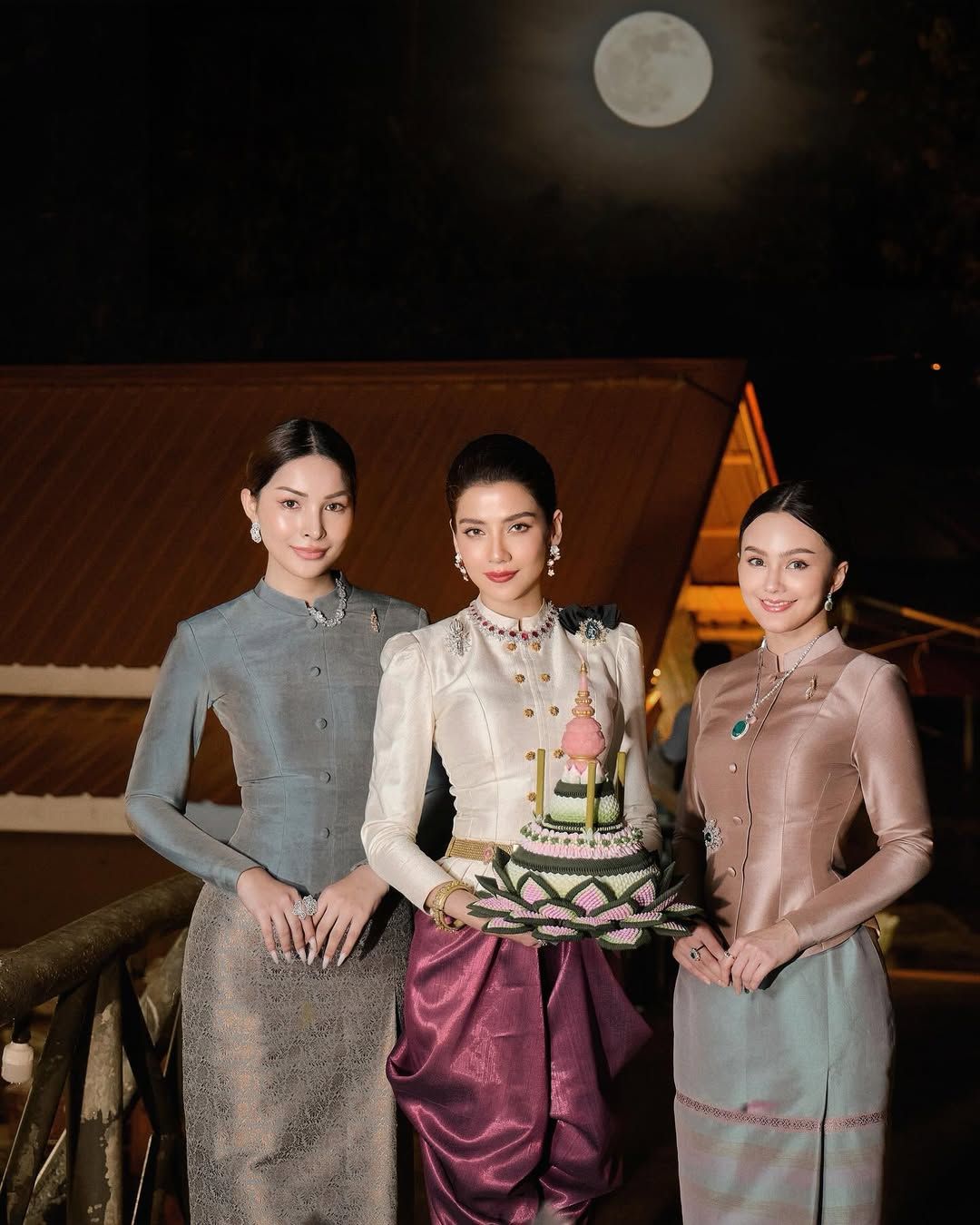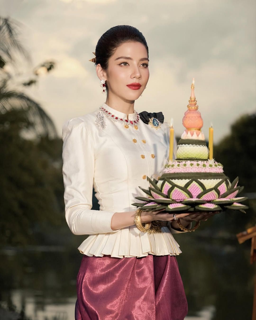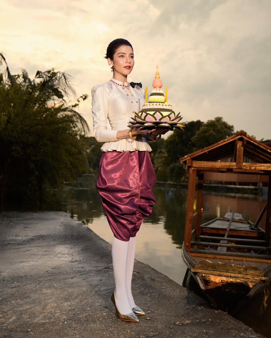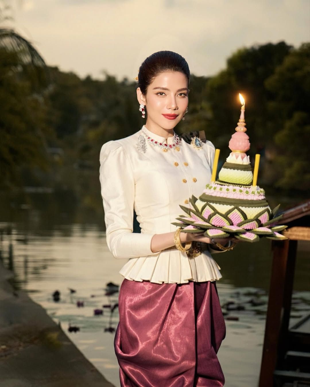 4 พฤศจิกายน 2568 ทำเอาโซเชียลตะลึงอีกครั้ง เมื่อ “จีน่า เดอะเฟซ” ปรากฏตัวในลุคชุดไทยสุดสง่า ถือกระทงรับคืนพระจันทร์เต็มดวง บอกเลยว่าสวยละมุนเหมือนหลุดออกมาจากวรรณคดี แต่งหน้าสไตล์เรียบหรูดูแพง ผมเกล้ารวบเรียบแบบไทยประยุกต์ เรียกได้ว่าสวยละมุนทุกองศา