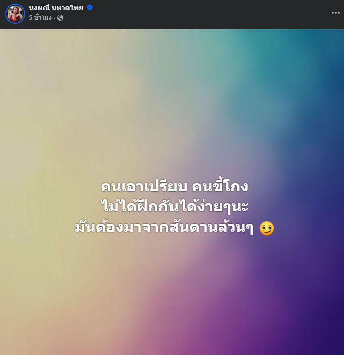 4 พฤศจิกายน 2568 ทำเอาโซเชียลร้อนระอุ เมื่อนักร้องลูกทุ่งสาวสายตรงอย่าง “จ๊ะ นงผณี” โพสต์ข้อความสุดเดือดลงเฟซบุ๊กส่วนตัว ว่า "คนเอาเปรียบ คนขี้โกง ไม่ได้ฝึกกันได้ง่ายๆนะ มันต้องมาจากสันดานล้วนๆ"