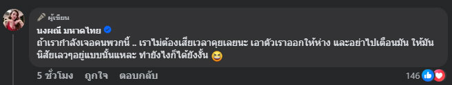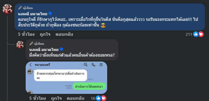 พร้อมเขียนข้อความในคอมเมนต์อีก ว่า "ตอนกูใจดี ก็รักษากูไว้เหอะ.. เพราะเมื่อไรที่กูยื่นโนติส นั่นคือกูสุดแล้วววว รอรับแรงกระแทกได้เลย!!! ไปสืบประวัติกูด้วย ถ้ากูฟ้อง กูต้องชนะร้อยเท่านั้น" , "ถ้าเรากำลังเจอคนพวกนี้ .. เราไม่ต้องเสียเวลาคุยเลยนะ เอาตัวเราออกให้ห่าง และอย่าไปเตือนมัน ให้มันนิสัยเลวๆอยู่แบบนั้นแหละ ทำยังไงก็ได้ยังงั้น"