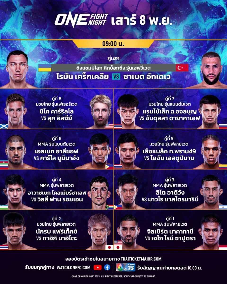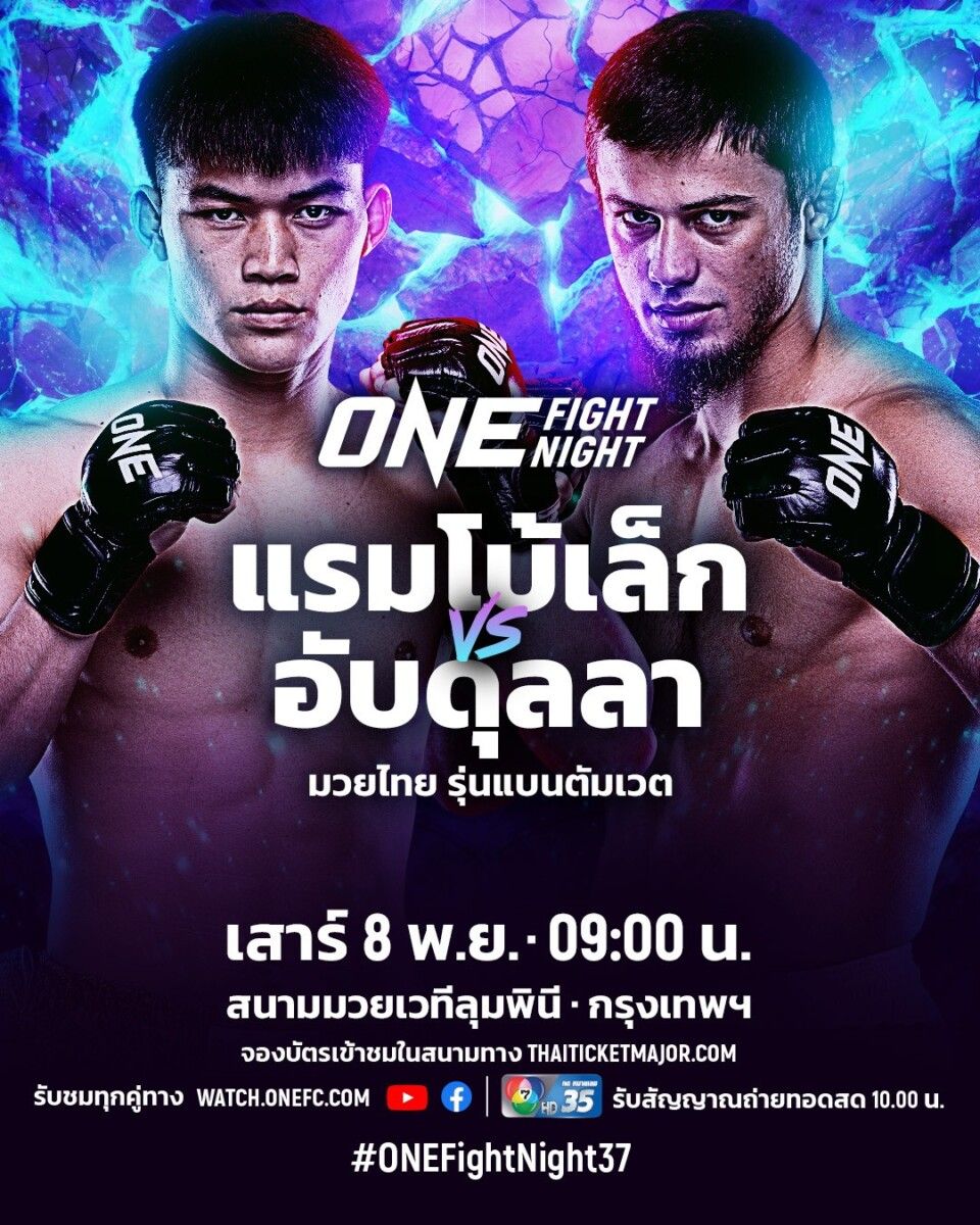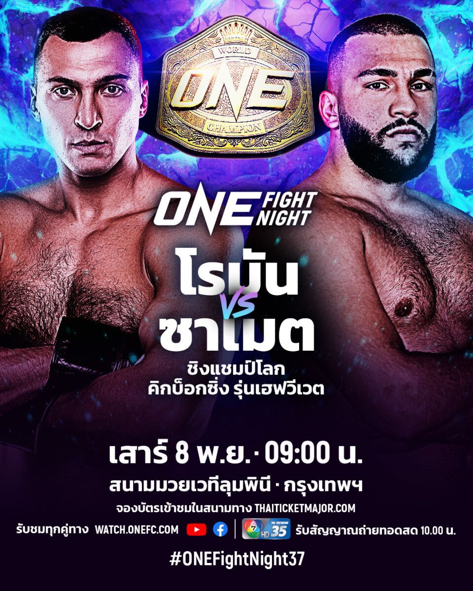 จากนั้น วันเสาร์ที่ 8 พฤศจิกายนนี้ มันจัดเต็มระดับพรีเมียมกับรายการ ONE Fight Night 37 คู่เอกเปิดศึกชิงแชมป์โลก คิกบ็อกซิ่ง รุ่น เฮฟวีเวต “โรมัน เคร็กเคลีย” ปะทะ “ซาเมต อักเดเว” ร่วมด้วยคู่มวยดังหลายคู่ รวมถึงยอดนักสู้ชาวไทยร่วมชิงชัย อาทิ แรมโบเล็ก ฉ.อจลบุญ เสื้อแบล็ค ท.พราน 49 นักรบ แฟร์เท็กซ์ ร่วมด้วยเหล่านักสู้อีกมากมาย รับชมการถ่ายทอดสดจากสนามมวยเวทีลุมพินี (รามอินทรา) ทาง ช่อง 7HD เวลา 10.00 น. และสามารถเกาะติด LIVE-Streaming คู่แรกเริ่มเวลา 08.00 น. ทาง Facebook : Ch7HD / Ch7HD News / Ch7HD Sports และ YouTube : Ch7HD
