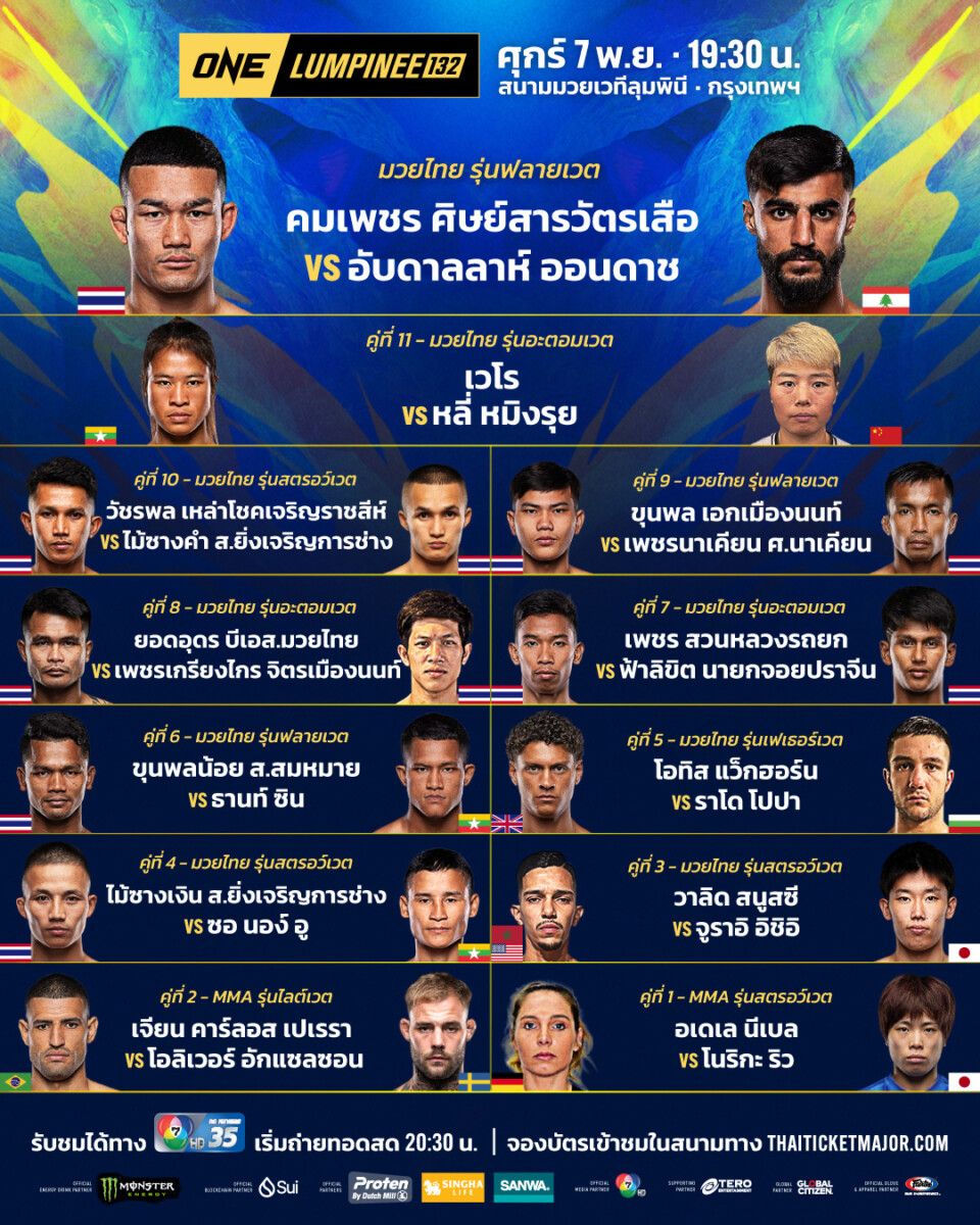 เปิดโปรแกรมเต็มศึก ช่อง 7HD เอาใจแฟนกีฬาโดยเฉพาะแฟนกำปั้น ส่งตรงความมันผ่านหน้าจอให้ได้เชียร์จัดเต็ม เริ่มด้วย วันศุกร์ที่ 7 พฤศจิกายนนี้ พบกับศึก ONE ลุมพินี 132 นำโดย คู่เอกของรายการ คมเพชร ศิษย์สารวัตรเสือมวยขวาดุดัน จากนครราชสีมา ท้าวัดพลังแกร่งกับ อับดาลลาห์ ออนดาช นักสู้ฟอร์มฮอต จากเลบานอน ที่แพ้แค่ครั้งเดียวจาก 7 ไฟต์ในศึกนี้ ภายใต้กติกามวยไทย รุ่นสตรอว์เวต ด้านคู่เอกภาคอินเตอร์ ขุนพลน้อย ส.สมหมาย จอมบู๊สายแข็งจากนครศรีธรรมราช เจ้าของผลงานชนะ 5 ไฟต์รวด ปะทะ ธานท์ ซิน นักชกอันตราย จากเมียนมา ที่ตั้งเป้ากู้ฟอร์มเก่งในกติกามวยไทย รุ่นฟลายเวต ร่วมด้วยคู่มวยมันอีกมากมาย
