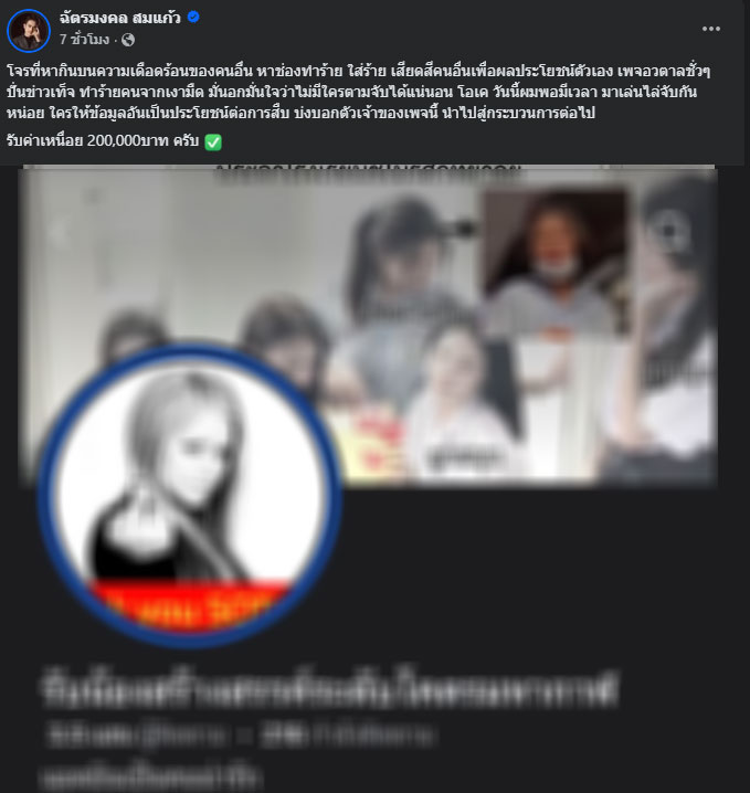 พร้อมข้อความระบุว่า "โจรที่หากินบนความเดือดร้อนของคนอื่น หาช่องทำร้าย ใส่ร้าย เสียดสีคนอื่นเพื่อผลประโยชน์ตัวเอง เพจอวตาลชั่วๆ ปั่นข่าวเท็จ ทำร้ายคนจากเงามืด มั่นอกมั่นใจว่าไม่มีใครตามจับได้แน่นอน โอเค วันนี้ผมพอมีเวลา มาเล่นไล่จับกันหน่อย ใครให้ข้อมูลอันเป็นประโยชน์ต่อการสืบ บ่งบอกตัวเจ้าของเพจนี้ นำไปสู่กระบวนการต่อไป
