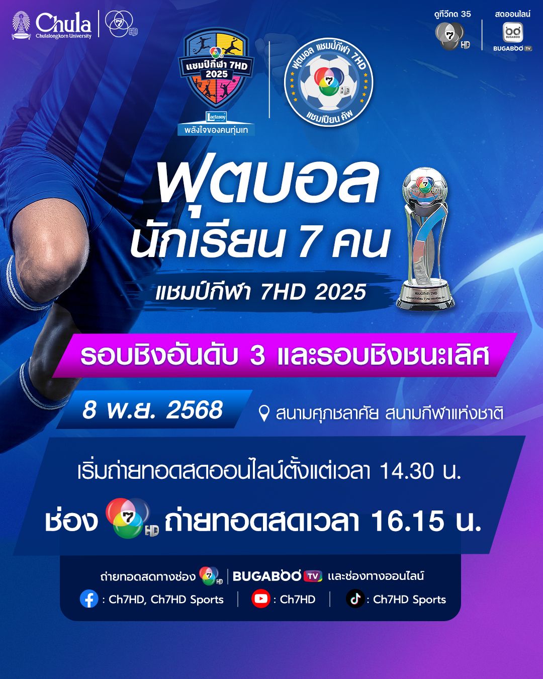 ใกล้ยลโฉมแชมป์หน้าใหม่ กับศึกลูกหนังขาสั้น ฟุตบอลนักเรียน 7 คน แชมป์กีฬา 7HD แชมเปียน คัพ 2025 กีฬาชนิดที่ 4 ของ 4 ซีรีส์ กีฬานักเรียน แชมป์กีฬา 7HD 2025 ที่ ช่อง 7HD จับมือ จุฬาลงกรณ์มหาวิทยาลัย และ กรมพลศึกษา ในวันเสาร์ที่ 8 พฤศจิกายนนี้ ที่ สนามศุภชลาศัย โดยเปิดให้แฟนฟุตบอลเข้าชมฟรี ! ขณะที่ผู้ชมหน้าจอสามารถเปิด ช่อง 7HD ชมและเชียร์สดไปพร้อมกัน โดยถ่ายทอดสดคู่ชิงชนะเลิศ ตั้งแต่เวลา 16.15 น. นอกจากนี้ยังมี 2 พระเอกสาวกลูกหนัง เบน-สันติราษฎร์ กุลนพเกียรติ และ โหน-ธนากร ศรีบรรจง ร่วมเชียร์สดพร้อมส่งกำลังใจให้กับเหล่านักเตะถึงขอบสนามอีกด้วย