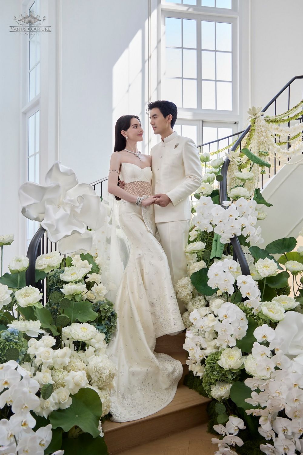 และวันนี้จะขอพาทุกคนไปชมภาพชุดแต่งงานไทยประยุกต์สุดอลังการของบ่าวสาวป้ายแดงที่ออกแบบโดยห้องเสื้อชื่อดังของเมืองไทย วนัช กูตูร์ คอนเซ็ปต์ชุดแต่งงานได้มาจากแรงบันดาลใจของแนวคิด “ความรักที่บริสุทธิ์” ซึ่งสาวใหม่ได้ร่วมออกแบบกับ ดร.สรรค์ สุดเกตุ ดีไซน์เนอร์ระดับโอต์กุตูร์แห่ง Vanus Couture โดยต้องการให้ชุดสะท้อนถึงความรักที่งดงาม อ่อนโยน และบริสุทธิ์ดั่ง “ดอกบัว” ดอกไม้ไทยที่เปี่ยมด้วยความหมายแห่งความสะอาดบริสุทธิ์ การงอกงาม และความรุ่งเรือง