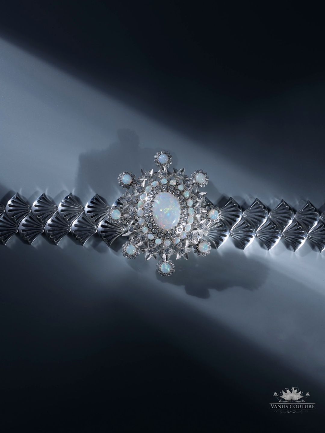 “วนัชมาลี” ประกอบด้วยเครื่องประดับ 4 ชิ้นหลัก ผลิตด้วยเทคนิคชั้นสูงของงานจิวเวลรี่ระดับโอต์กูตูร์ ประดับด้วย พลอยเพทายขาว สัญลักษณ์ของความบริสุทธิ์ ซื่อสัตย์ และความสำเร็จ และ โอปอล อัญมณีแห่งความหวังและความรักที่เปี่ยมด้วยแสงสีรุ้ง เปรียบดังสีสันแห่งความสุขในชีวิตสมรส
