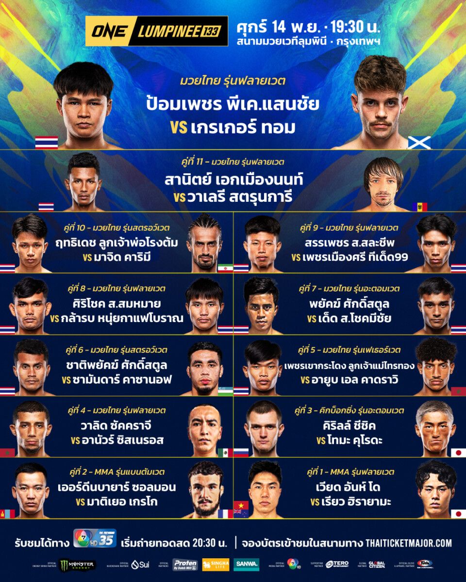 ร่วมติดตามชมถ่ายทอดสดจาก สนามมวยเวทีลุมพินี (รามอินทรา) ทางช่อง 7HD กด 35 สดออนไลน์ทาง BUGABOO.TV ตั้งแต่เวลา 20.30 น. นอกจากนี้คอกีฬาสามารถเกาะติด LIVE-Streaming ตั้งแต่เวลา 19.30 น. ทาง Facebook : Ch7HD / Ch7HD News / Ch7HD Sports และ YouTube : Ch7HD สามารถจองบัตรเข้าชมมวยที่สนามล่วงหน้าได้ทาง www.thaiticketmajor.com หรือสามารถติดตามรายละเอียดเพิ่มเติมได้ทาง https://www.ch7.com/one-championship, Facebook : Ch7HD / ONE Championship Thailand และ TERO Digitalและวันอาทิตย์ที่ 16 พฤศจิกายนนี้ พบกับรายการ มวยไทย 7 สี ถึงคิวที่แฟนมวยรอคอย “ศึกชิงแชมป์ศึกมวยปูนเสือ มวยไทยพันธุ์แท้” ครั้งที่ 24 เปิดสังเวียนมวยคูมันกับการชิงแชมป์ในคู่เอกระหว่าง อนันตชัย ลานนาวอเตอร์ไซค์ ปะทะกับยอดเหล็กแหลม พ.พิมพ์อร และในคู่แรกเป็นการชิงอันดับ 3 ระหว่าง ก้องสนั่น ส.เทียนโพธิ์ กับ พลายพยัคฆ์