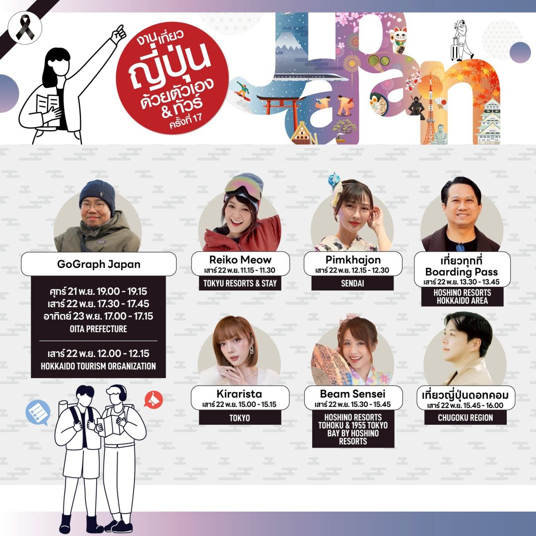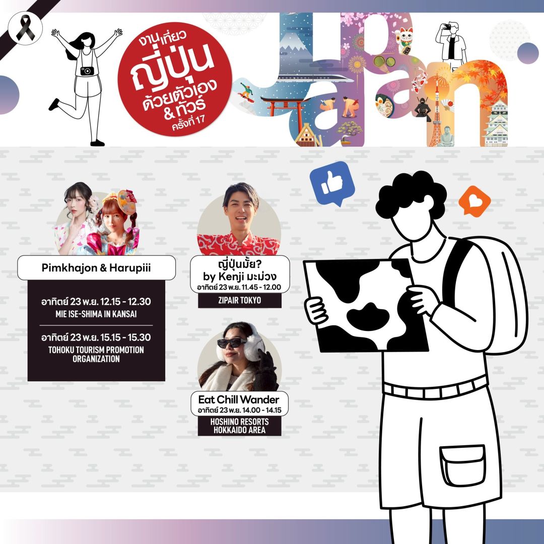 ใครหลงรักญี่ปุ่นต้องห้ามพลาด! ร่วมสัมผัสกลิ่นอายสไตล์ต้นตำรับในใจกลางกรุงเทพฯ ได้อย่างใกล้ชิด เดินชิลเหมือนไปญี่ปุ่นจริง เจอครบทั้งเมืองหลัก–เมืองรอง พร้อมโปรฯ เที่ยวสุดคุ้มในงาน “เที่ยวญี่ปุ่นด้วยตัวเอง & ทัวร์ ครั้งที่ 17” (Visit Japan FIT Fair #17) ระหว่างวันที่ 21 - 23 พฤศจิกายน 2568 ณ พารากอนฮอลล์ ศูนย์การค้าสยามพารากอน ชั้น 5