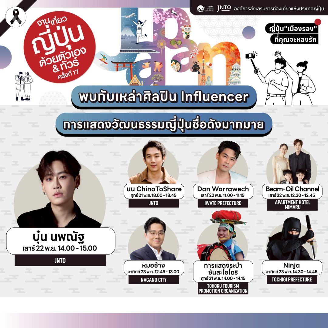 สายเที่ยวเตรียมตัวให้พร้อม เพราะมหกรรมท่องเที่ยวประเทศญี่ปุ่นที่ใหญ่ที่สุดในประเทศไทย ที่เหล่าสาวกเจแปนเลิฟเวอร์ตั้งตารอมากที่สุดกลับมาแล้ว! กับงาน “เที่ยวญี่ปุ่นด้วยตัวเอง & ทัวร์ ครั้งที่ 17” (Visit Japan FIT Fair #17) โดยองค์การส่งเสริมการท่องเที่ยวแห่งประเทศญี่ปุ่น (JNTO) สำนักงานกรุงเทพฯ ซึ่งครั้งนี้มาในธีม “ญี่ปุ่น ‘เมืองหลัก เมืองรอง’ ที่คุณจะหลงรัก" ที่คุณจะได้พบกับบูธกิจกรรมกว่า 160 บูธ รวมถึงโปรโมชันสุดพิเศษจากสายการบิน โรงแรม และทัวร์ญี่ปุ่นชั้นนำที่พาเหรดกันมาสานฝันคนอยากเที่ยวญี่ปุ่นให้เป็นจริง พร้อมกิจกรรมสุดคาวาอี้ ทั้งโชว์วัฒนธรรมญี่ปุ่น ทอล์กโชว์สุดสนุก ของพรีเมียมสุดคิ้วท์จาก JNTO และมินิคอนเสิร์ตสุดเซอร์ไพรส์จากเหล่าดารา–อินฟลูเอนเซอร์ชื่อดัง ที่จะมามอบความสนุกต่อเนื่องตลอดทั้งวัน แล้วพบกันวันศุกร์ที่ 21 - วันอาทิตย์ที่ 23 พฤศจิกายน 2568 ณ พารากอนฮอลล์ ศูนย์การค้าสยามพารากอน ชั้น 5