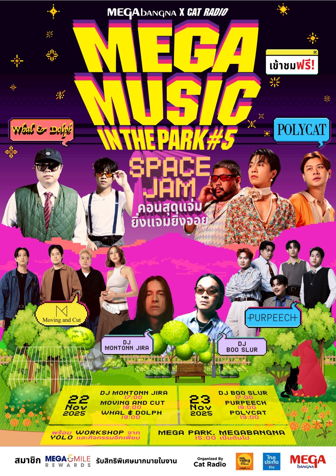 ศูนย์การค้าเมกาบางนา แหล่งช้อปปิ้งที่ใหญ่ที่สุดแห่งกรุงเทพฯ ฝั่งตะวันออก พร้อมเติมเต็มประสบการณ์ชีวิตที่ดีในทุกๆ วัน ด้วยแนวคิด YOUR EVERYDAY MEETING PLACE จับมือ CAT RADIO ไทยประกันชีวิต และ ซันแวลเล่ย์ เตรียมมอบความสุขในช่วงเวลาส่งท้ายปี กับงานดนตรีกลางสวนสุดยิ่งใหญ่ “MEGA MUSIC IN THE PARK #5: SPACE JAM คอนสุดแจ่ม ยิ่งแจม ยิ่งจอย” ระหว่างวันที่ 22–23 พฤศจิกายน 2568 ณ สวนเมกา พาร์ค พื้นที่สีเขียวใจกลางศูนย์การค้าเมกาบางนา เข้าชมฟรีตลอดสองวัน โดยครั้งนี้กลับมาพร้อมบรรยากาศแห่งความสุขท่ามกลางธรรมชาติกับคอนเซปต์สุดจอย พบกับศิลปินคุณภาพ ได้แก่ Polycat, Purpeech, Whal & Dolph, Moving and Cut, , DJ Montonn Jira, และ DJ Boo Slur พร้อมโชว์พิเศษ Jamming Session จากการโคจรมาพบกันของศิลปินทั้งสี่วง ที่จะสร้างโมเมนต์สุดเอ็กซ์คลูซีฟให้แฟนๆ ได้สัมผัสอย่างใกล้ชิด นอกจากนี้ยังมีกิจกรรมสุดชิลให้ร่วมสนุกตลอดวัน อย่างการเวิร์กชอปรักษ์โลกจาก YOLO Zero Waste Your Life, โซนถ่ายภาพPhoto Booth สุดเก๋ และกิจกรรมพิเศษสำหรับสมาชิกเมกา สไมล์ รีวอร์ดส พร้อมของที่ระลึกสุดเอ็กซ์คลูซีฟจากไทยประกันชีวิตและซันแวลเล่ย์