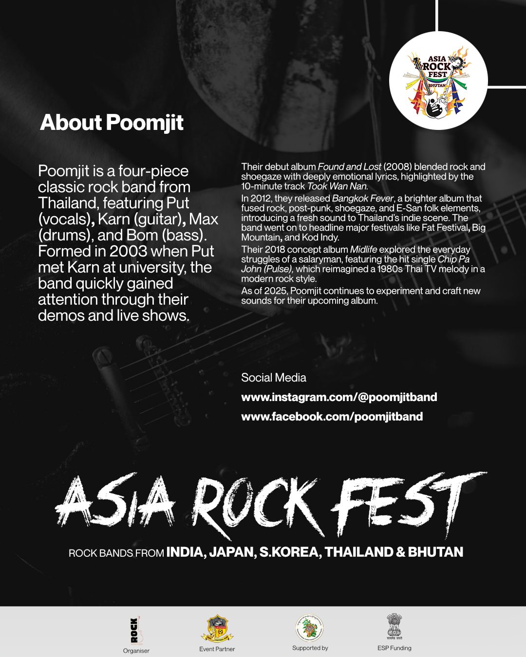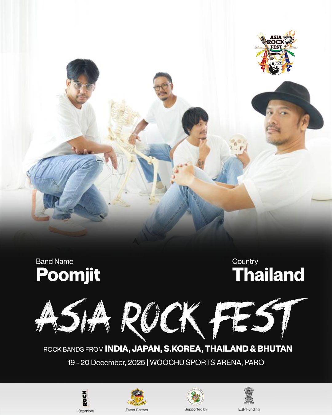 วงดนตรีร็อกขวัญใจสายอินดี้จากไทย ‘ภูมิจิต (Poomjit)’ เตรียมบินลัดฟ้าร่วมเทศกาลดนตรีระดับภูมิภาค Asia Rock Fest 2025 ซึ่งจะจัดขึ้นวันที่ 19–20 ธันวาคม 2025 ที่ Woochu Sports Arena เมืองพาโร ประเทศภูฏาน นับเป็นครั้งแรกของวงร็อกไทยในการขึ้นแสดงในประเทศภูฏาน และเป็นอีกก้าวสำคัญในการพาดนตรีไทยร่วมเวทีเดียวกับศิลปินจากหลายชาติในเอเชีย