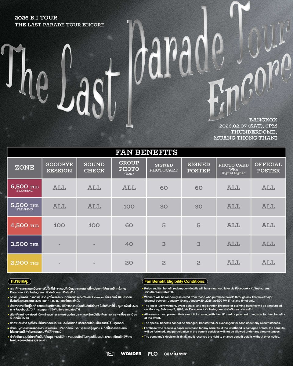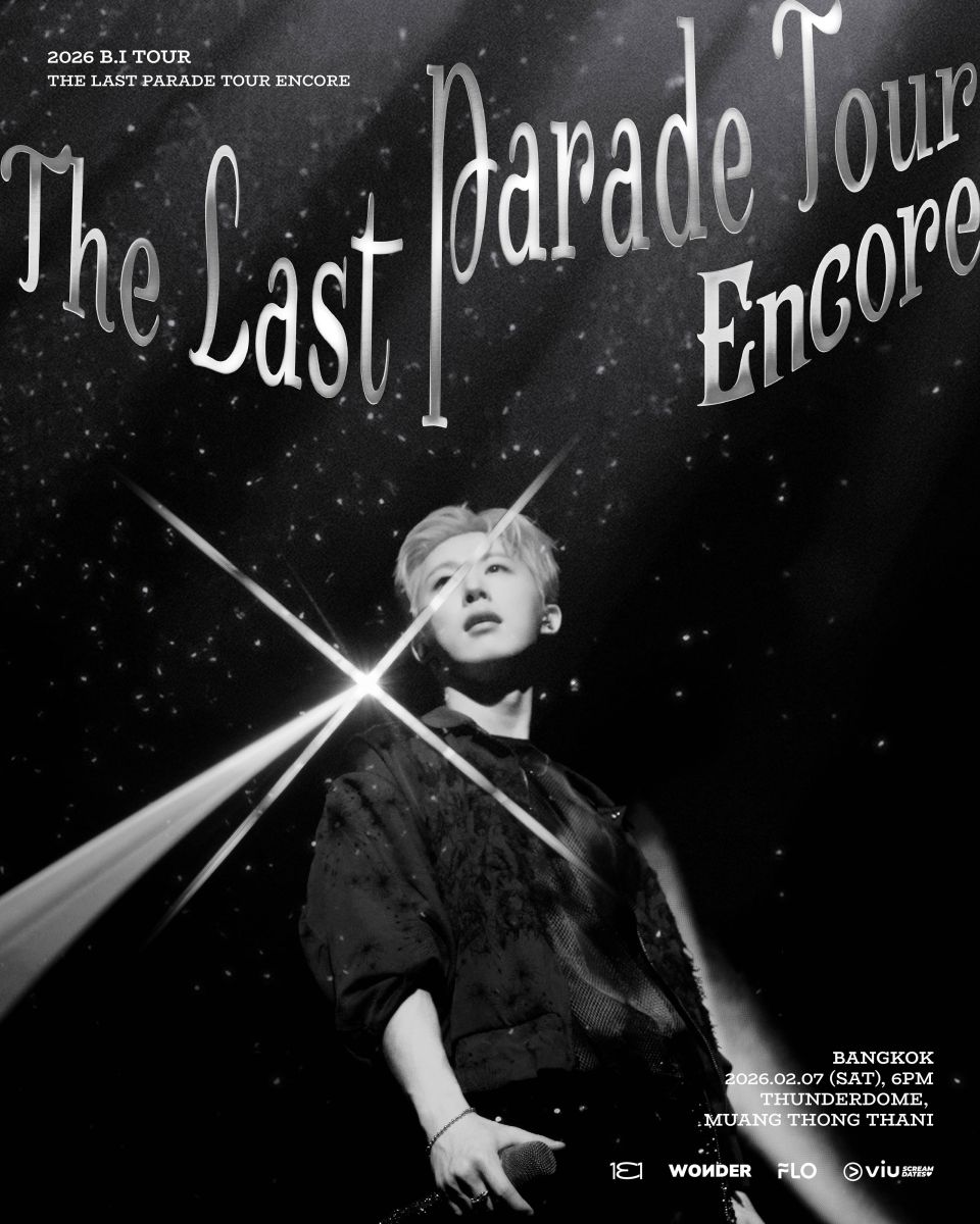 อย่าพลาดโอกาสสุดท้ายที่จะได้สัมผัสความทรงจำอันอบอุ่นและเต็มไปด้วยพลังจากศิลปินหนุ่มที่ครองใจแฟนเพลงทั่วโลก เพราะครั้งนี้ B.I จะพาทุกคนกระโดดไปพร้อมกันอีกครั้ง ในค่ำคืนแห่งเสียงดนตรี รอยยิ้ม และความรู้สึกที่ไม่มีวันลืม เตรียมนิ้วให้พร้อม เตรียมหัวใจให้แน่น แล้วมาสร้างประวัติศาสตร์หน้าใหม่ไปด้วยกันใน “2026 B.I TOUR: The Last Parade Tour ENCORE in BANGKOK” เพราะนี่อาจเป็นพาเหรดแห่งความทรงจำที่ไม่มีซ้ำสองอีกแล้ว!