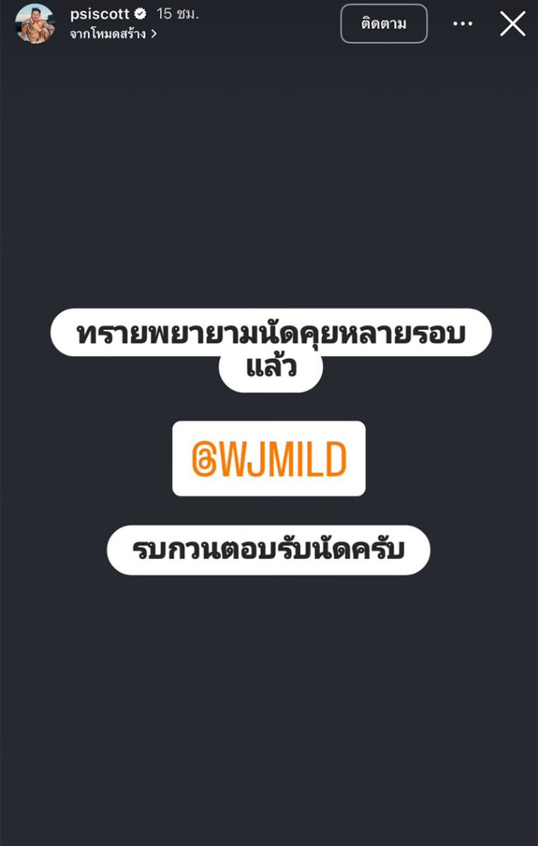 18 พฤศจิกายน 2568 ทำเอาชาวเน็ตอยากใส่ใจเมื่อจู่ๆ 'ทราย สก็อต' หรือ ทราย สิรณัฐ สก็อต น้องชายของ 'พาย สุนิษฐ์' สามีของนักแสดงสาวสวยไซซ์มินิ 'มายด์ ลภัสลัล' สะใภ้คนใหม่ของตระกูลดังภิรมย์ภักดี โดย 'ทราย สก็อต' ได้โพสต์ไอจีแท็กข้อความถึง 'มายด์ ลภัสลัล' ด้วยข้อความที่ทำเอาหลายคนอยากรู้ว่า "ทรายพยายามนัดคุยหลายรอบแล้ว @wjmild รบกวนตอบรับด้วยครับ"