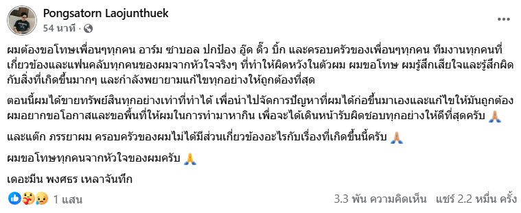ตอนนี้ผมได้ขายทรัพย์สินทุกอย่างเท่าที่ทำได้ เพื่อนำไปจัดการปัญหาที่ผมได้ก่อขึ้นมาเองและแก้ไขให้มันถูกต้อง ผมอยากขอโอกาสและขอพื้นที่ให้ผมในการทำมาหากิน เพื่อจะได้เดินหน้ารับผิดชอบทุกอย่างให้ดีที่สุดครับ