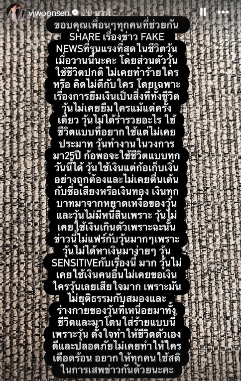 จากกรณีที่สังคมออนไลน์มีการเผยแพร่ข่าวลือที่พาดพิงถึงดารา-นักแสดงอักษรย่อ "น." ขณะที่เพจปลอมโยงมาที่นักแสดงสาวชื่อดังอย่าง วุ้นเส้น วิริฒิพา ภักดีประสงค์ ล่าสุดเจ้าตัวได้ออกมาเคลื่อนไหวผ่านอินสตาแกรมสตอรี่ @vjwoonsen เพื่อชี้แจงประเด็นดังกล่าว