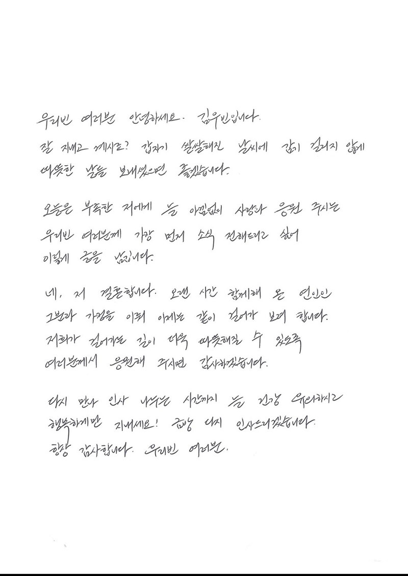 โดยพระเอกชื่อดัง 'คิม อูบิน' โพสต์จดหมายที่เขียนด้วยลายมือประกาศข่าวการแต่งงานกับนักแสดงสาวชื่อดัง 'ชิน มินอา' ภายในจดหมายระบุว่า "สวัสดีทุกคนครับ ผมคิม อูบินเองครับ หวังว่าทุกคนสบายดีนะครับ ช่วงนี้อากาศเริ่มเย็นลงอย่างกะทันหัน ผมหวังว่าคุณจะอบอุ่นและไม่เป็นหวัดนะครับ วันนี้ผมเขียนโพสต์นี้ขึ้นมาเพราะอยากเป็นคนแรกที่จะมาบอกข่าวกับทุกคนนะครับ อูรีบิน ผู้ที่คอยมอบความรักและกำลังใจให้ผมเสมอมา แม้ว่าผมจะมีข้อบกพร่องบางประการก็ตาม