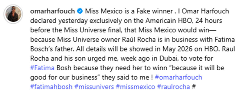 "Miss Mexico is a Fake winner . I Omar Harfouch declared yesterday exclusively on the Americain HBO, 24 hours before the Miss Universe final, that Miss Mexico would win—because Miss Universe owner Raúl Rocha is in business with Fatima Bosch’s father. All details will be showed in May 2026 on HBO. Raul Rocha and his son urged me, week ago in Dubai, to vote for #Fatima Bosh because they need her to winn “because it will be good for our business” they said to me!"