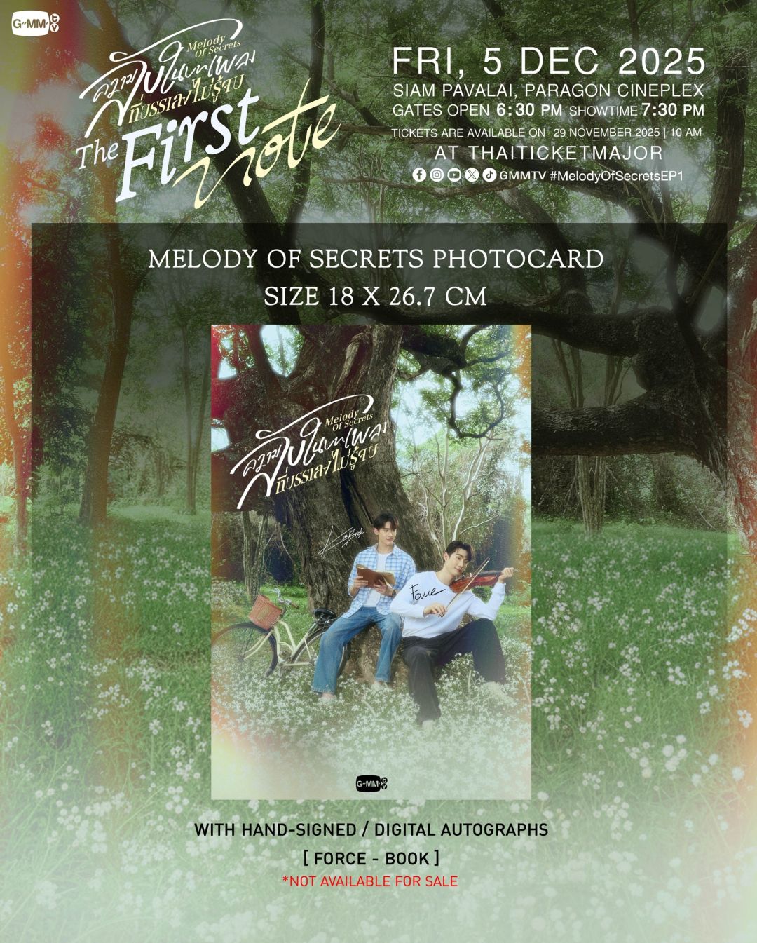 ได้เวลาเปิดความลับของบทเพลงไปพร้อมๆ กัน กับสองนักแสดงสุดฮอต “ฟอส-จิรัชพงศ์ ศรีแสง” และ “บุ๊ค-กษิดิ์เดช ปลูกผล” ที่จะมาพาแฟนๆ ลุ้นระทึกและร่วมค้นหาความจริงของเรื่องราวความรัก ความสัมพันธ์สุดลึกลับ ที่ซับซ้อนซ่อนเงื่อน ในบทบาทใหม่ที่ “ฟอส-บุ๊ค” กลับมาสร้างแรงดึงดูดสุดฟินอีกครั้ง กับงาน “ความลับในบทเพลงที่บรรเลงไม่รู้จบ Melody of Secrets : The First Note” โดย “GMMTV” คอนเทนต์โพรไวเดอร์ชั้นนำของเมืองไทย พร้อมชวนแฟนๆ ร่วมดูตอนแรกซีรีส์ “ความลับในบทเพลงที่บรรเลงไม่รู้จบ Melody of Secrets” บนจอภาพยนตร์กันครั้งแรก พร้อมด้วยผู้กำกับฯ คุณภาพ “ตะวัน จารุจินดา” และ “อริษา แวววรรณจิตร” ที่จะมาพูดคุยถึงเบื้องลึกเบื้องหลังสนุกๆ กับโชว์สุดเอ็กซ์คลูซีฟจากเหล่านักแสดงที่เตรียมมามอบให้แฟนๆ ได้ฟินกันอย่างจุใจ ในวันศุกร์ที่ 5 ธันวาคมนี้ เวลา 19.30 น. เป็นต้นไป ณ ชั้น 6 สยามพารากอน โรงภาพยนตร์สยามภาวลัย Paragon Cineplex เตรียมล็อคคิวรับความสนุกครบรสพร้อมกันได้เลย ห้ามพลาดเด็ดขาด!