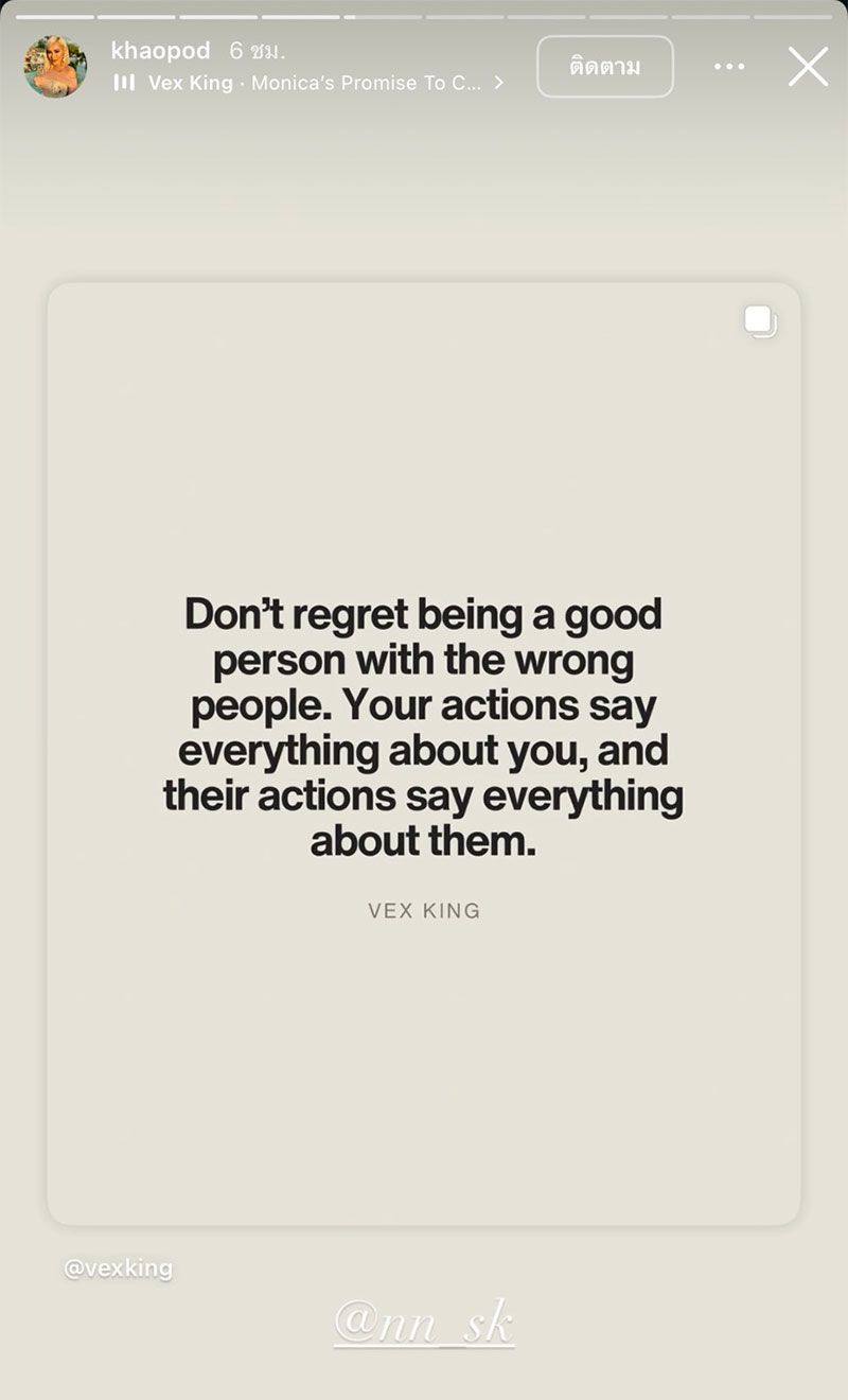 ซึ่งพบว่า 'คุณข้าวโพด สมิทธินันท์' ก็ได้โพสต์ไอจีสตอรี่เป็นคำคมภาษาอังกฤษและภาษาไทยรัวๆ เลยทีเดียว ซึ่งเนื้อหาคำคมที่เจ้าตัวโพสต์พูดเกี่ยวกับเรื่องคน อาทิเช่น ....