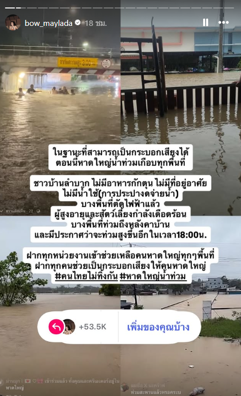 ล่าสุด โบว์ ได้แชร์ภาพน้ำท่วมลงในสตอรี่ไอจีส่วนตัว ระบุข้อความว่า "ในฐานะที่สามารถเป็นกระบอกเสียงได้ ตอนนี้หาดใหญ่น้ำท่วมเกือบทุกพื้นที่ ชาวบ้านลำบาก ไม่มีอาหารกักตุน ไม่มีที่อยู่อาศัย ไม่มีน้ำใช้ (การประปางดจ่ายน้ำ) บางพื้นที่ตัดไฟแล้ว ผู้สูงอายุและสัตว์เลี้ยงกำลังเดือดร้อน บางพื้นที่ท่วมถึงหลังคาบ้าน และมีประกาศว่าจะท่วมสูงขึ้นอีกในเวลา 18.00 น. ฝากทุกหน่วยงานเข้าช่วยเหลือคนหาดใหญ่ทุก ๆ พื้นที่ ฝากทุกคนช่วยเป็นกระบอกเสียงให้คนหาดใหญ่"