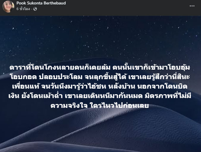 "ดาราที่โดนโกงหลายคนก็เคยล้ม คนนั้นเขาก็เข้ามาโอบอุ้ม โอบกอด ปลอบประโลม จนลุกขึ้นสู้ได้ เขาเลยรู้สึกว่านี่สินะเพื่อนแท้ จนวันนึงมารู้ว่าไอ้ชห หลังบ้าน นอกจากโดนบิดเงิน ยังโดนเม้าฉ่ำ เขาเลยเดินหนีมากันหมด มิตรภาพที่ไม่มีความจริงใจ ใครไหวไปก่อนเลย"