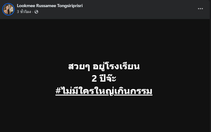 โดยเจ้าตัวได้โพสต์ข้อความแรงในเฟซบุ๊กส่วนตัว Lookmee Russamee Tongsiriprisri ระบุว่า “สวยๆ อยู่โรงเรียน 2 ปีจ๊ะ #ไม่มีใครใหญ่เกินกรรม”