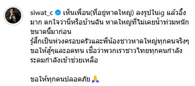 ล่าสุด นักแสดงหนุ่มชื่อดัง "ซี ศิวัฒน์" ซึ่งมีบ้านเกิดอยู่ที่อำเภอหาดใหญ่ ได้ออกมาแสดงความห่วงใยต่อเหตุการณ์ที่เกิดขึ้น โดยซีได้โพสต์ภาพสถานการณ์น้ำท่วมผ่านอินสตาแกรม พร้อมแคปชั่นว่า “เห็นเพื่อน (ที่อยู่หาดใหญ่) ลงรูปใน IG แล้วอึ้งมาก ตกใจว่านี่หรือบ้านฉัน หาดใหญ่ที่ไม่เคยน้ำท่วมหนักขนาดนี้มาก่อน รู้สึกเป็นห่วงครอบครัวและพี่น้องชาวหาดใหญ่ทุกคนจริงๆ ขอให้สู้ๆ และอดทน เชื่อว่าพวกเราชาวไทยทุกคนกำลังระดมกำลังเข้าช่วยเหลือ ขอให้ทุกคนปลอดภัย”