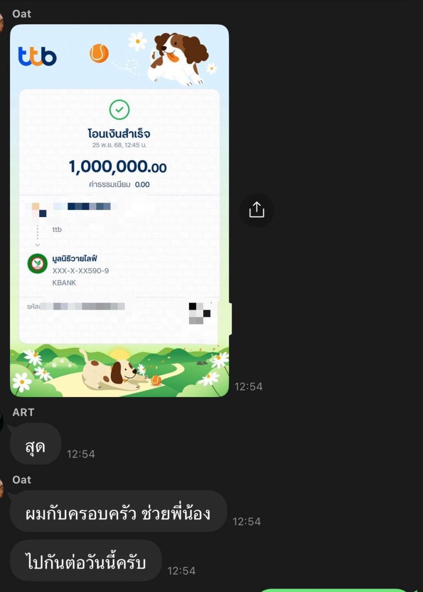 และต่อมา ป๊อป ปองกูล ได้โพสต์สลิปการโอนเงินของ โอ๊ต ปราโมทย์ ที่ร่วมบริจาคเป็นจำนวนเงินสูงถึง 1,000,000 บาท ให้กับมูลนิธิวายไลฟ์ เพื่อใช้ในการช่วยเหลือและจัดส่งสิ่งจำเป็นให้กับชาวบ้านในพื้นที่ที่ได้รับผลกระทบ พร้อมข้อความว่า “ขอบคุณ ครอบครัว ปาทาน ครับ”