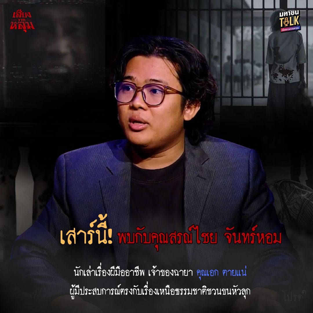 “ชอน” พาไปพบกับ “คุณเอก ตายแน่” ที่จะมาเปิดเรื่องจริงวัยเด็กที่ “โรงเรียนแห่งนั้น” ที่จำติดตาจนทุกวันนี้ ในตอน “สุกัญญา” สัปดาห์นี้ ชอน-ชวิศการ วรโรจน์โยธิน พิธีกรประจำรายการพอดแคสต์ เสียงจากหลุม จากโปรเจกต์ “มหาชนTalk” วันนี้เป็นเรื่องราวเหตุการณ์จริงที่เกิดขึ้นของ “คุณเอก สรณ์ไชย จันทร์หอม” นักเล่าเรื่องผีมืออาชีพ เจ้าของฉายา “คุณเอก ตายแน่” ผู้มีประสบการณ์ตรงกับเรื่องเหนือธรรมชาติชวนขนหัวลุก