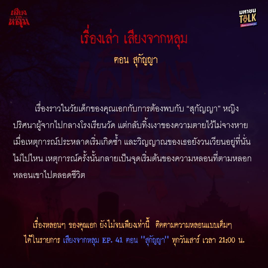 การไปโรงเรียนในวัยเด็ก ที่ควรจะเป็นวันธรรมดาเหมือนทุกครั้ง แต่กลับมีเหตุการณ์ลึกลับเกิดขึ้นและกลายเป็นจุดเริ่มต้นของความหลอนที่ฝังอยู่ในใจไปตลอดกาล และทำให้ “โรงเรียนแห่งนั้น” กลายเป็นสถานที่ที่ไม่มีใครอยากกลับไปเหยียบอีกเรื่องราวในวัยเด็กของคุณเอก ราว 15 ปีก่อน ตอนอยู่ชั้นป.5 คุณเอก ถูกย้ายมาเรียน “โรงเรียนวัด” ในปริมณฑลโรงเรียนกับวัดรั้วติดกัน เดินทะลุได้ง่าย เสียงระฆัง กลิ่นธูป และลานปูนหน้าศาลาการเปรียญคือภาพประจำ กระทั่งต้องเจอกับเหตุการณ์ ซึ่งได้กลายมาเป็นภาพติดตาจนถึงทุกวันนี้ และทุกครั้งที่นึกถึง ก็ยังรู้สึกขนลุกเหมือนเดิมทุกครั้งกับการต้องพบกับ หญิงปริศนาวัย 40-50 ปี สติไม่ค่อยดี ชอบขอเงินครู ผู้ปกครอง และเด็ก ๆ เพื่อนำไปซื้อสุรา กระทั่งพบศพเธอนอนคว่ำ เลือดนองพื้น ไหลยาว และมีลำไส้ส่วนหนึ่งโผล่ข้างกาย ตรวจสอบพบว่าเธอชื่อ “สุกัญญา” จากนั้นไม่นาน ก็มีเหตุการณ์ประหลาดเริ่มเกิดซ้ำ และวิญญาณของเธอยังวนเวียนอยู่ที่นั่นไม่ไปไหน เหตุการณ์ครั้งนั้นกลายเป็นจุดเริ่มต้นของความหลอน ที่ตามหลอกหลอนเขาไปตลอดชีวิต เรื่องหลอน ๆ ของ คุณเอก ยังไม่จบเพียงเท่านี้ ติดตามความหลอนเต็ม ๆ ได้ใน ตอน สุกัญญา ในรายการ เสียงจากหลุม ในวันเสาร์ที่ 29 พฤศจิกายนนี้ เวลา 21.00 น เป็นต้นไป ทาง YouTube Ch7HD : https://bit.ly/ytsiangchaklum ทาง Facebook Ch7HD : https://bit.ly/siangchaklumfb ทางเว็บไซต์ BUGABOO.TV : https://bit.ly/siangchaklumonline ส่วนใครที่มีเรื่องราวสยองขวัญที่อยากมาแชร์ สามารถแอดไลน์มาเล่าได้ที่ @mahachontalk พบกับรายการพอดแคสต์ “เสียงจากหลุม” โปรเจ็กต์ มหาชนTalk อัปเดตอีพีใหม่ ทุกวันเสาร์ เวลา 21.00 น. ทาง YouTube, Facebook : Ch7HD และเว็บไซต์ BUGABOO.TV และติดตามข่าวสารความเคลื่อนไหวรายการต่าง ๆ ได้ทางช่อง 7HD ดูทีวีกด 35 สดออนไลน์ BUGABOO.TV และช่องทางออนไลน์ Ch7HD (Facebook, IG, X, YouTube) และ Ch7HD Entertainment (Facebook, IG) และเว็บไซต์ www.ch7.com