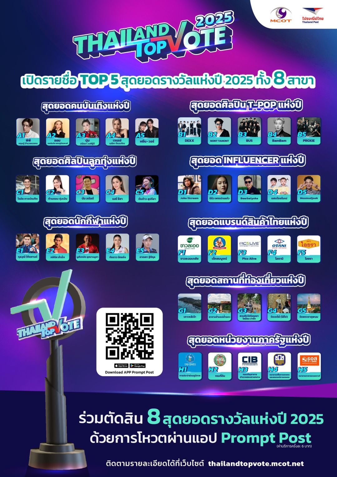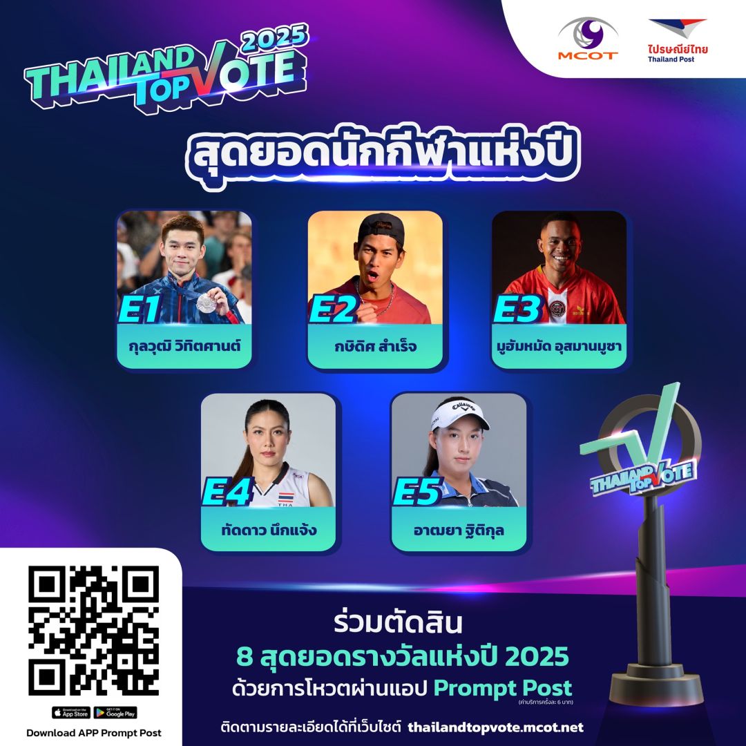 พร้อมเปิดโผ เปิดโหวต 8 สาขารางวัล TOP 5 ของประเทศ กับ “Thailand Top Vote 2025” VOICES OF WORTH เสียงแห่งคุณค่า รางวัลที่สร้างความภาคภูมิใจ สร้างแรงบันดาลใจ พร้อมกำลังใจ ให้กับบุคคลและองค์กรในหลากหลายวงการ จากการร่วมมือระหว่าง บริษัท อสมท จำกัด (มหาชน) และ บริษัท ไปรษณีย์ไทย จำกัด กับ 8 รางวัลที่มาจากการโหวตของคนทั้งประเทศ พร้อม 2 รางวัลเกียรติยศ สุดยอดนักบริหารแห่งปีจากภาครัฐและภาคเอกชน จากการคัดเลือกจากคณะกรรมการผู้ทรงคุณวุฒิ โดยมีสถาบันบัณฑิตพัฒน บริหารศาสตร์ (นิด้า) สนับสนุนการทำโพล และผู้ที่ก้าวเข้าสู่ TOP 5 ของประเทศ ในแต่ละสาขา จากเสียงที่อยู่ในใจของคุณ มาเป็นเสียงแห่งคุณค่า