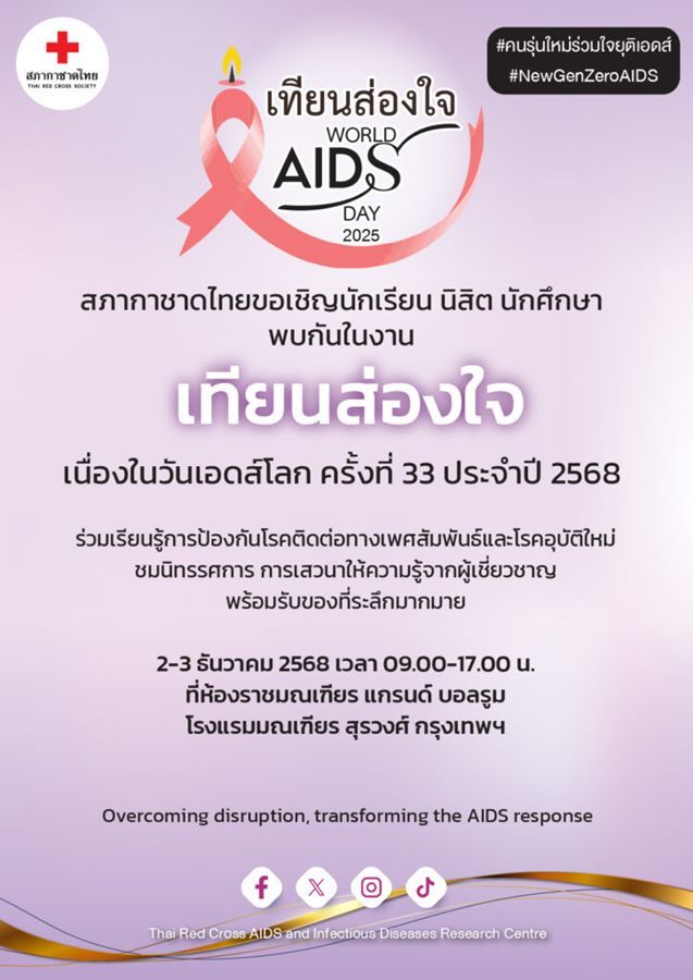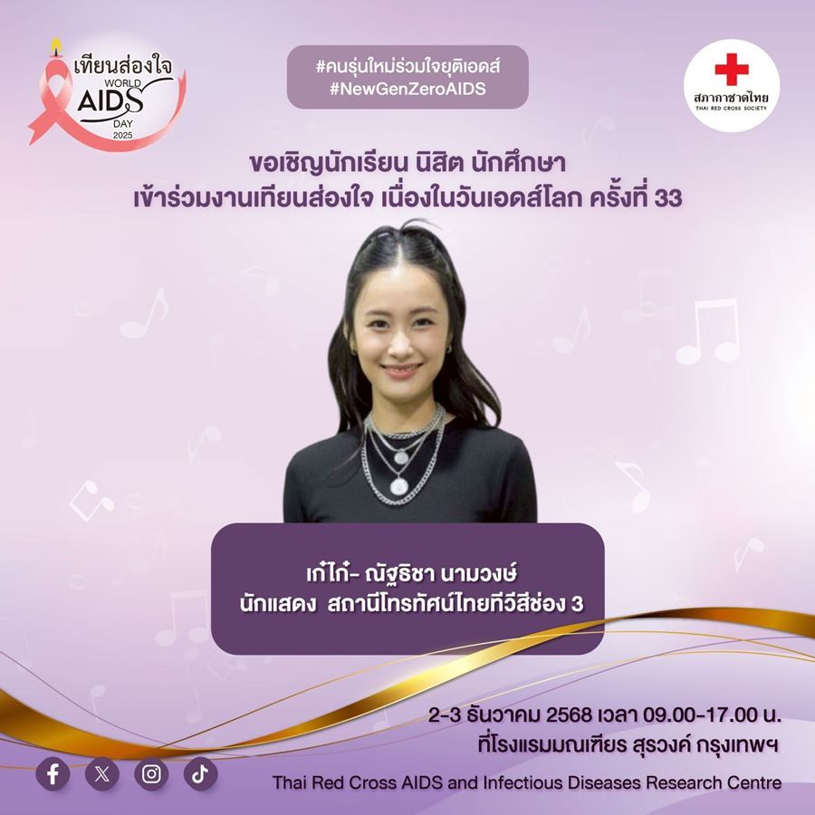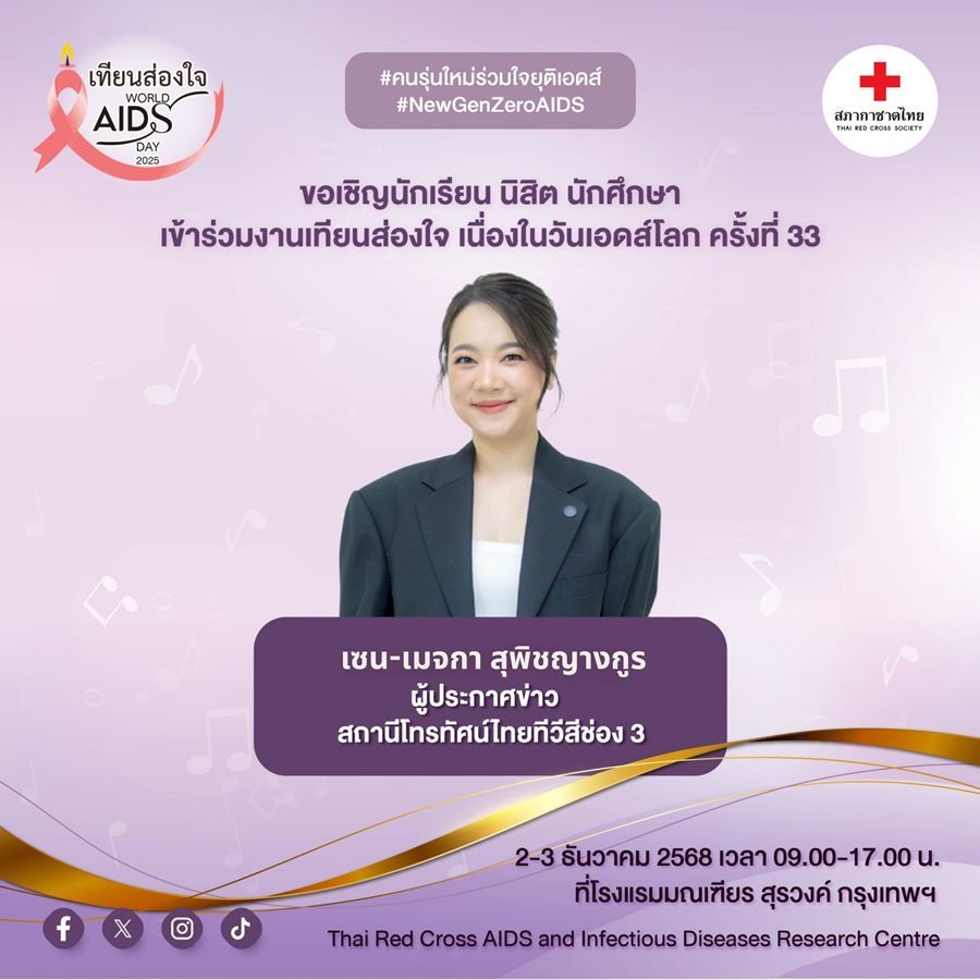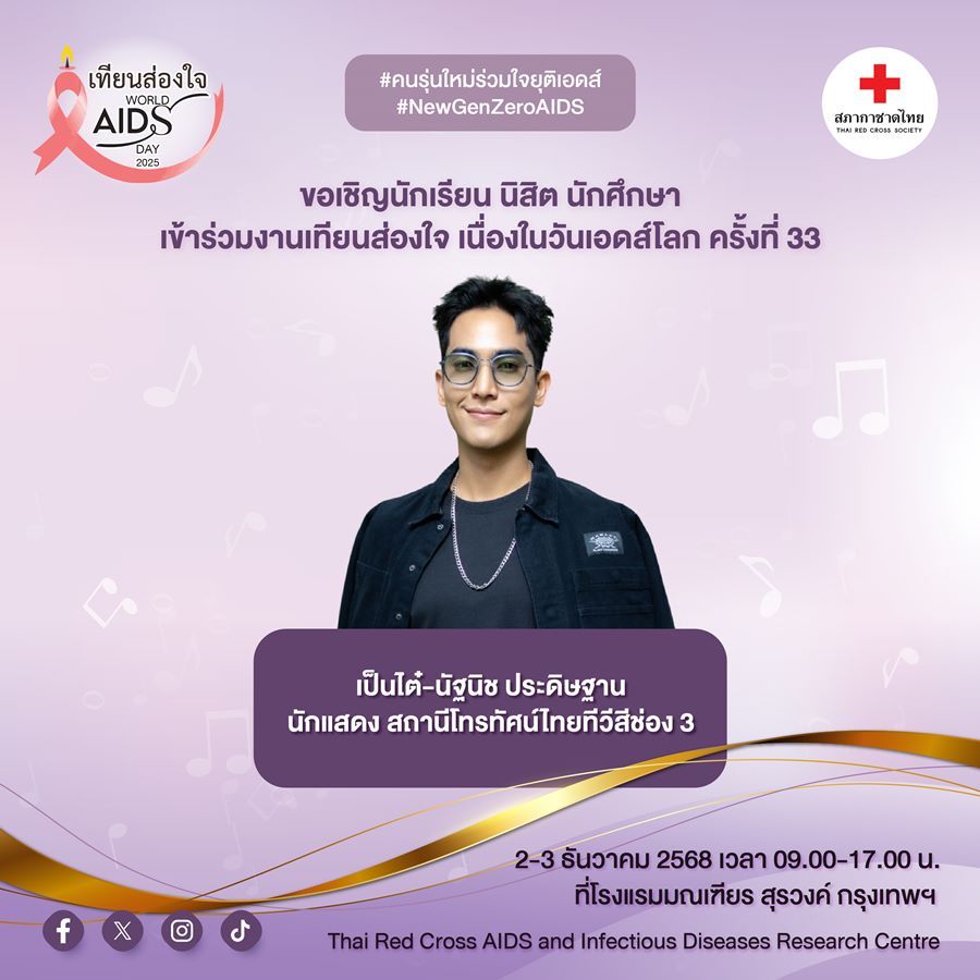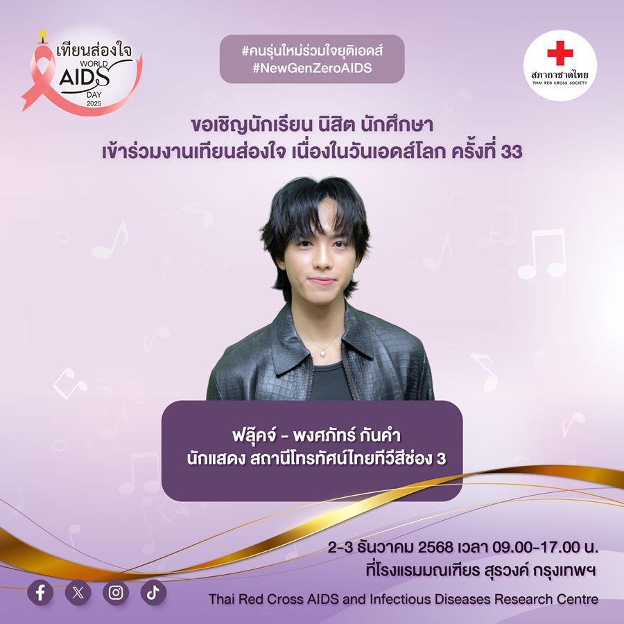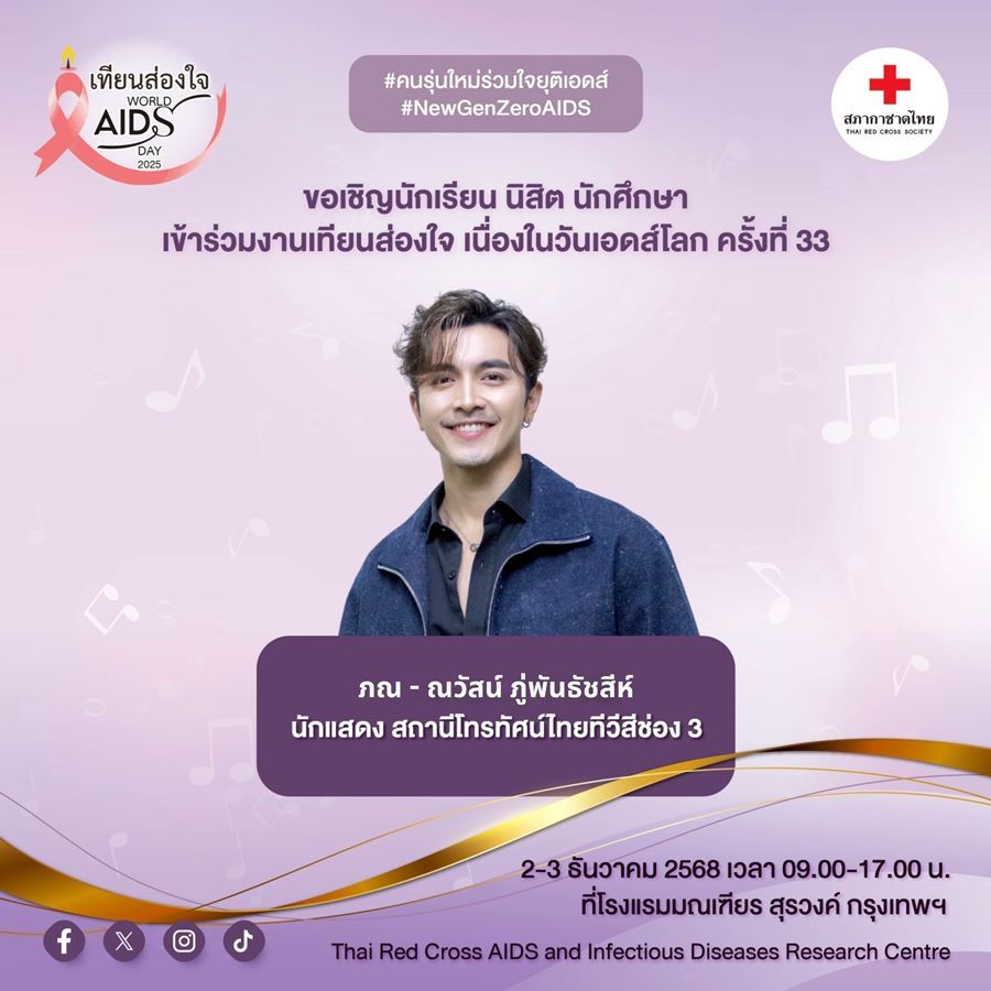 นักแสดงช่อง 3 ร่วมด้วย ภณ-ณวัสน์ ภู่พันธัชสีห์, เก๋ไก๋- ณัฐธิชา นามวงษ์, เป็นไต๋-นัฐนิช ประดิษฐาน, ฟลุ๊คจ์ - พงศภัทร์ กันคำ พร้อมด้วย เซน-เมจกา สุพิชญางกูร ผู้ประกาศข่าวช่อง 3 ร่วมถ่ายภาพโปสเตอร์และสปอตวิดีโอประชาสัมพันธ์เชิญชวนเยาวชนร่วมงาน “เทียนส่องใจ เนื่องในวันเอดส์โลก” ครั้งที่ 33 ประจำปี 2568 ระหว่างวันที่ 2-3 ธันวาคม 2568 เวลา 09.00-17.00 น. ณ ห้องราชมณเฑียร แกรนด์ บอลรูม โรงแรมมณเฑียร สุรวงศ์ กรุงเทพฯ ภายใต้แนวคิด “คนรุ่นใหม่ร่วมใจยุติเอดส์ : New Gen Zero AIDS” โดยมีวัตถุประสงค์เพื่อสร้างความตระหนักรู้ในการป้องกันเชื้อเอชไอวี/เอดส์ ร่วมกันรณรงค์ลดจำนวนผู้ติดเชื้อ ลดการตีตรา และไม่เลือกปฏิบัติในสังคม ตลอดจนส่งเสริมให้ประชาชนมีความรู้ความเข้าใจในการป้องกันโรคเอดส์และโรคติดต่อทางเพศสัมพันธ์ที่ถูกต้อง รวมถึงโรคติดต่อทางเพศสัมพันธ์ และโรคอุบัติใหม่ เช่น ฝีดาษวานร ที่ยังคงมีการแพร่ระบาดในประเทศไทย