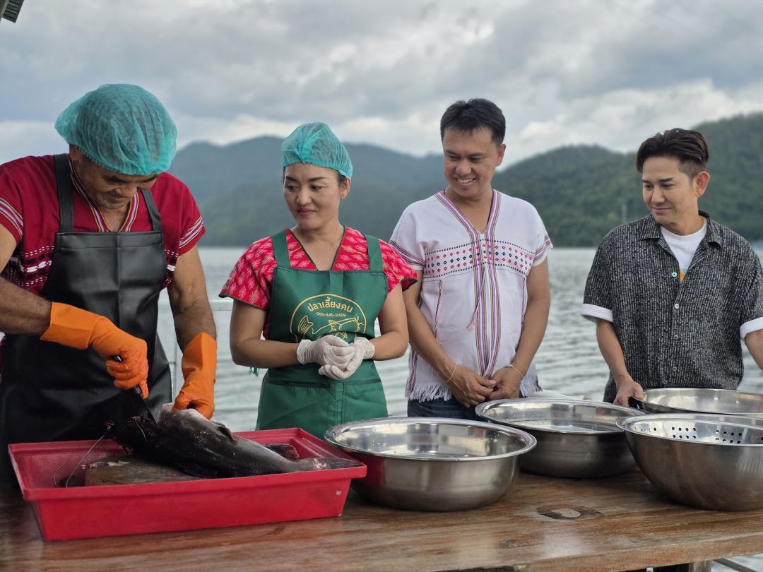 ซึ่งที่ วิสาหกิจชุมชนแปรรูปสัตว์น้ำปลาเลี้ยงคนเขื่อนศรีนครินทร์ แห่งนี้ ต้องบอกว่าทำเอา พ่อเอ ลูกแป้ง ตื่นตาตื่นใจกันมาก เพราะที่นี่มีปลามากมายทั้ง ปลาคัง, ปลาแรด, ปลาทับทิม, ปลากราย ฯลฯ ซึ่งแต่ละชนิดล้วนแต่ตัวใหญ่ ๆ มาถึงถิ่นแล้วตามสไตล์ เอ แป้ง ที่ต้องล้วงลึกแบบจัดเต็ม ทั้งเจาะลึกพูดคุยถึงวิธีการเลี้ยง ระยะเวลาในการเลี้ยงปลาแต่ละชนิด ก่อนที่จะไปดูการแปรรูปเนื้อปลาคัง, ทอดมันปลากรายพริกกระเหรี่ยง แต่ละผลิตภัณฑ์ต้องบอกว่าหน้าตาดีมากจริง ๆ แถมวันนี้ชาวบ้านก็จัดเต็มเสิร์ฟเมนูเด็ดที่ทำจากปลาคังให้ได้ชิมกันด้วย ก่อนกลับ พ่อเอ-ลูกแป้ง ไม่ลืม ที่เชิญชวนชาวบ้านยกผลิตภัณฑ์ของดีมาให้แฟน ๆ รายการได้เห็น