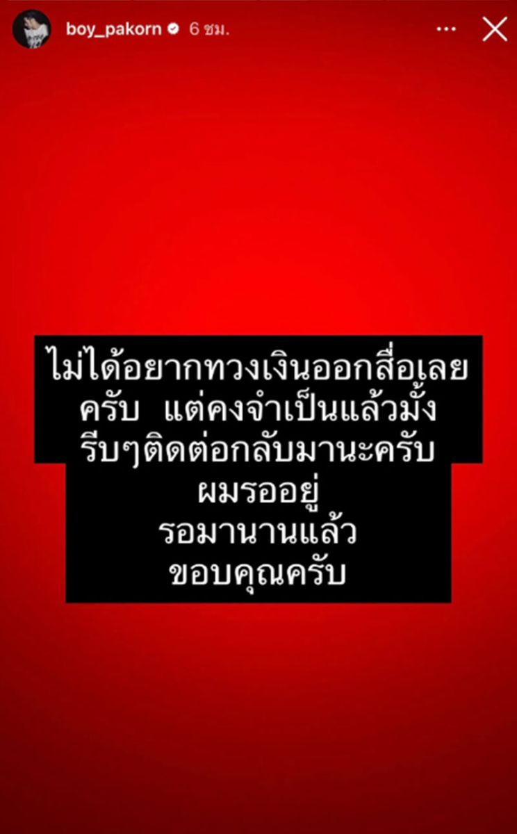29 พฤศจิกายน 2568 เกิดอะไรขึ้นเมื่อจู่ๆ พระเอกดัง 'บอย' ปกรณ์ ฉัตรบริรักษ์ ได้ออกมาโพสต์ไอจีสตอรีสุดเดือดทวงเงินลูกหนี้ออกสื่อ โดยในไอจีสตอรี่ '@boy_pakorn' ได้โพสต์ภาพแบ็กกราวนด์วสีแดง พร้อมทั้งเขียนข้อความสั้นๆ ว่า "ไม่ได้อยากทวงเงินออกสื่อเลยครับ แต่คงจำเป็นแล้วมั้ง รีบๆ ติดต่อกลับมานะครับ ผมรออยู่ รอมานานแล้ว ขอบคุณครับ"