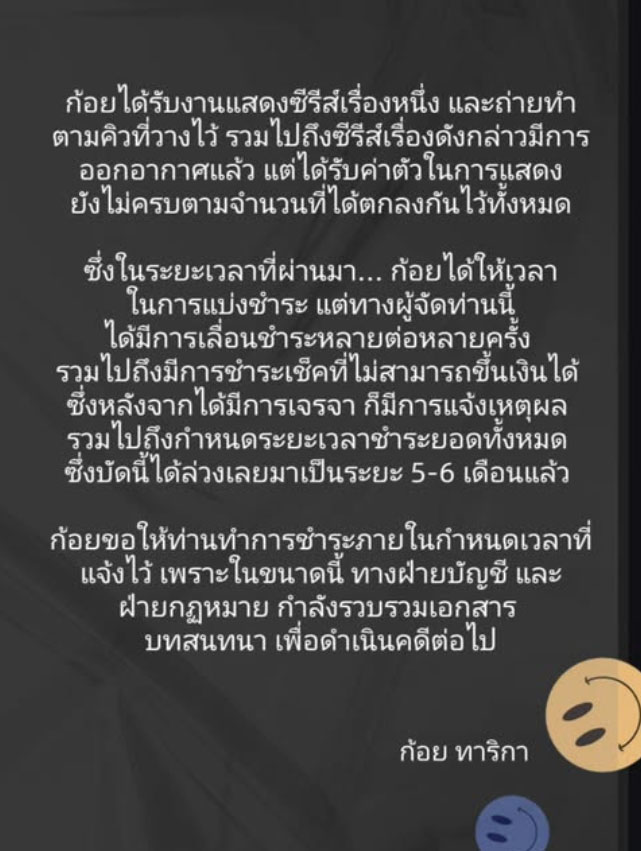ซึ่งในระยะเวลาที่ผ่านมา… ก้อยได้ให้เวลาในการแบ่งชำระ แต่ทางผู้จัดท่านนี้ได้มีการเลื่อนชำระหลายต่อหลายครั้ง รวมไปถึงมีการชำระเช็คที่ไม่สามารถขึ้นเงินได้ ซึ่งหลังจากได้มีการเจรจา ก็มีการแจ้งเหตุผล รวมไปถึงกำหนดระยะเวลาชำระยอดทั้งหมด ซึ่งบัดนี้ได้ล่วงเลยมาเป็นระยะ 5-6 เดือนแล้ว