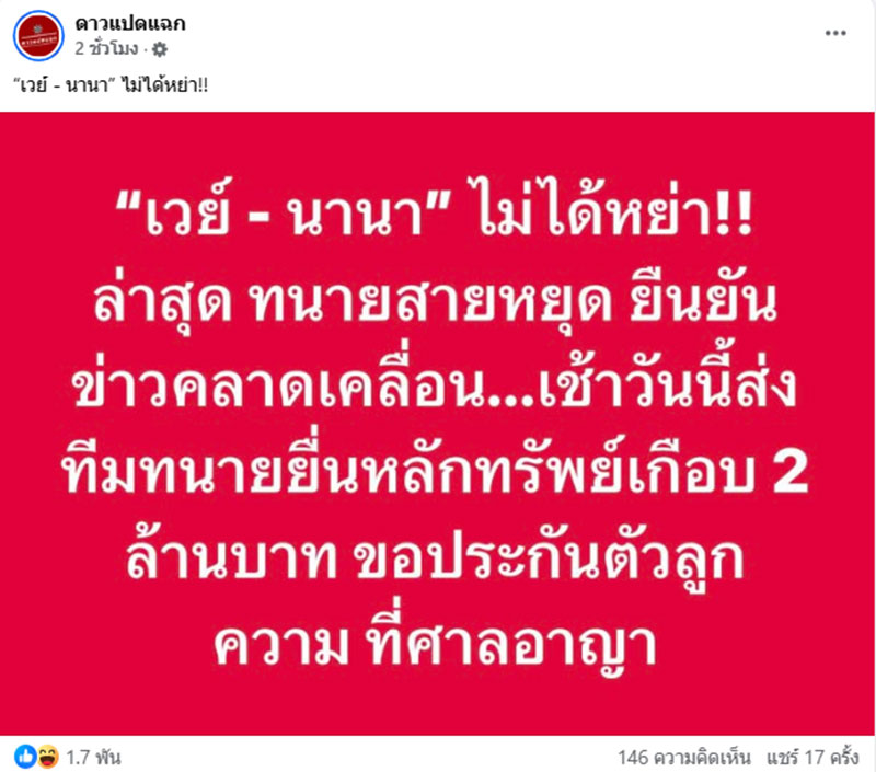 ล่าสุดทางเพจ ดาวแปดแฉก ได้ออกมาเผยข้อมูลผ่านทางเฟซบุ๊กถึงเรื่องราวดังกล่าวที่สวนทางกับกระแสการยืนยันที่เคยบอกเป็นเรื่องจริง ระบุว่า "เวย์ - นานา ไม่ได้หย่า!! ล่าสุด ทนายสายหยุด ยืนยันข่าวคลาดเคลื่อน...เช้าวันนี้ส่งทีมทนายยื่นหลักทรัพย์เกือบ 2 ล้านบาท ขอประกันตัวลูกความ ที่ศาลอาญา" งานนี้ยังไม่มีใครออกมาคอนเฟิร์มด้วยหลักฐานจริงๆ ว่า สรุปประเด็นการหย่าร้างของเวย์และนานาเป็นเรื่องจริง หรือแค่ข่าวลือกันแน่