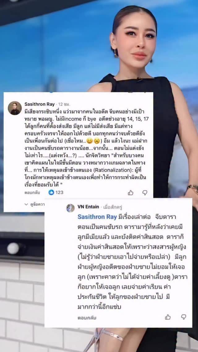 จากนั้น ยังได้มีคนมาคอมเมนต์ต่อว่า "มีเรื่องเล่าต่อ จีบดาราตอนเป็นคนขับรถ ดารามารู้ทีหลังว่าเคยมีลูกมีเมียแล้ว และยังติดค่าสินสอด ดาราก็จ่ายเงินค่าสินสอดให้ เพราะว่าสงสารผู้หญิง (ไม่รู้ว่าฝ่ายชายเอาไปจ่ายหรือเปล่า) มีลูก ฝ่ายหญิงในอดีตของฝ่ายชายไม่ยอมให้เจอลูก (เพราะคาดว่าไม่ได้จ่ายค่าเลี้ยงดู) ดาราก็อยากให้เจอลูก เลยจ่ายค่าเรียน ค่าประกันชีวิต ให้ลูกของฝ่ายชายไป มีมากกว่านี้อีก แซ่บ"
